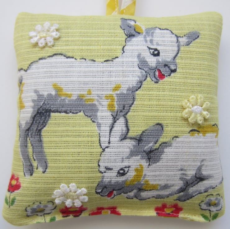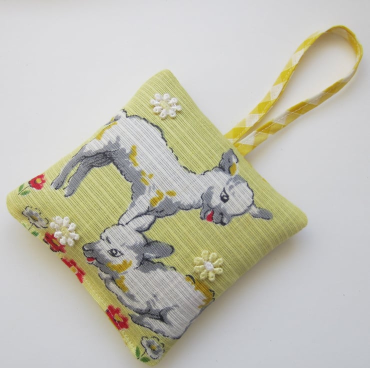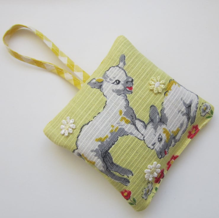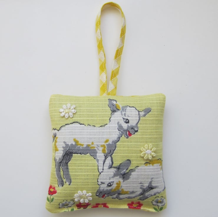 Hanging lavender sachet made from an unused vintage 1950s fabric featuring 2 lambs and decorated with 3 lace daisies. It is backed with yellow and white check gingham fabric.