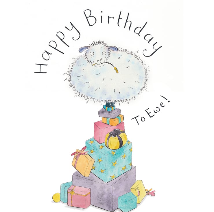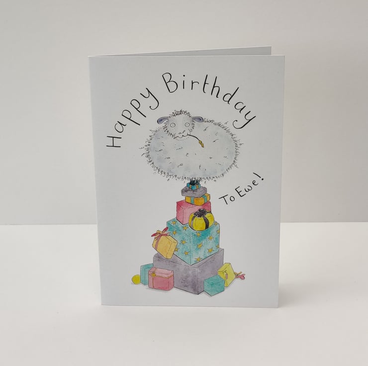Cute Happy Birthday Card. Handmade watercolour design with sheep and gifts and the words "Happy Birthday to Ewe"