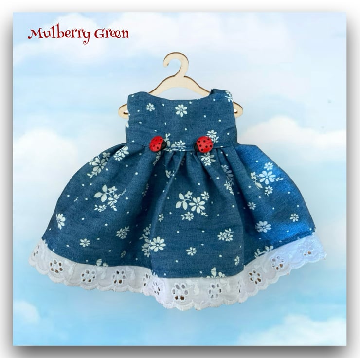 A sweet little denim dress covered in little white flowers and decorated at the waist with two little ladybirds, to fit the Mulberry Green dolls. The dress is handmade from best quality cotton and fastens at the back with two little poppers. It 8s trimmed at the hem with broderie anglais.