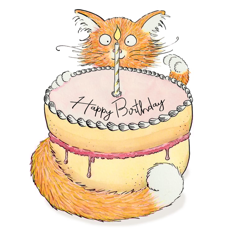 A Birthday Card for cat lovers! The cards shows a ginger cat and a cake with the words Happy Birthday on it