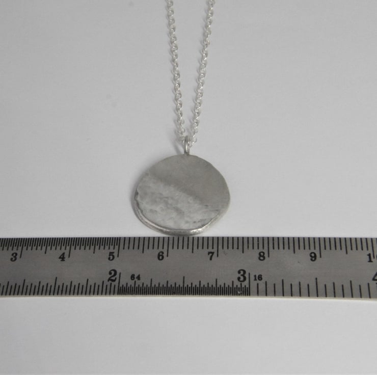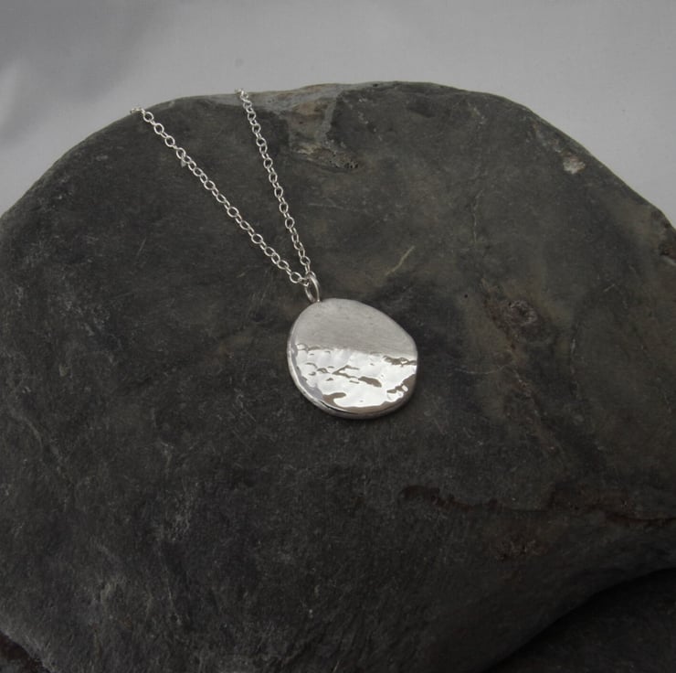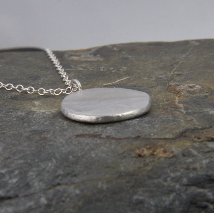 The pebble is organically made and formed of silver that has been melted. The melted silver, that naturally forms in to a pebble like shape is then forged with a hammer to flatten it. Each and every pebble will be unique in shape, just like the beach pebbles that inspired it. Half of the flattened pebble has a hammered texture, with a high shine, depicting the reflection on the sea as the sun peers through the hazy clouds. The remaining half has a light brushed finish that merges with the high shine hammered texture, just as the horizon merges the sea to the hazy sky. The pebble attaches to a trace style chain - your choice of length - via a ring, positioned on the top of it.