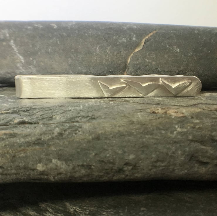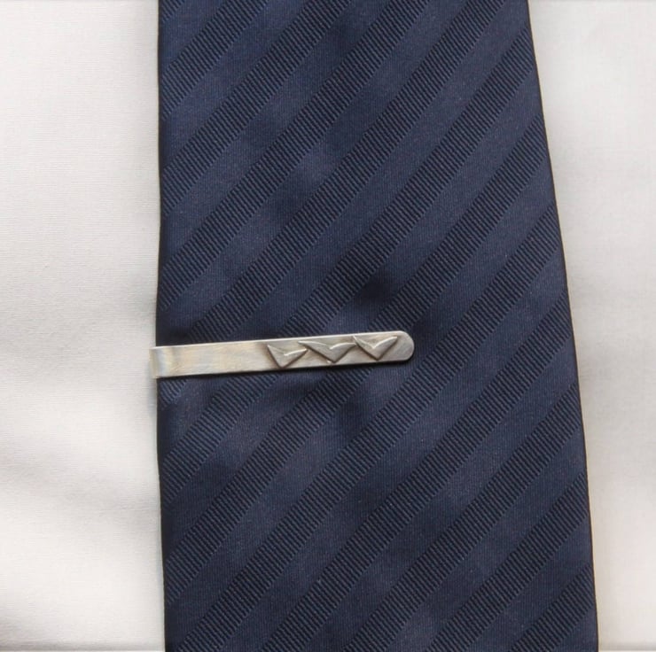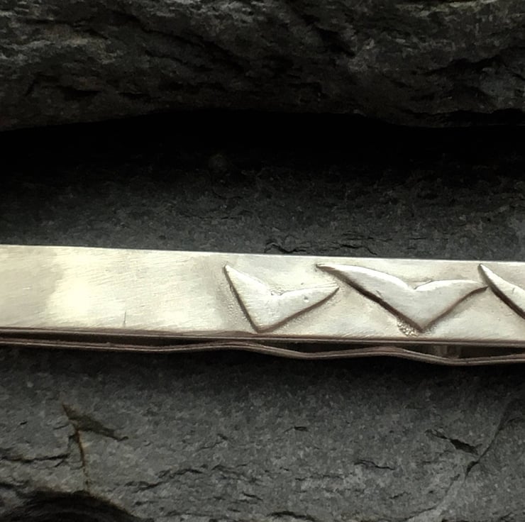 The 3 birds are all hand cut from Sterling Silver sheet, no one is the same. They are positioned off centre and at different angles to give a sense of perspective, depicting the irregularities of flight. The result is a one of a kind tie slide, where just like a real flock of birds, where no one is the same!