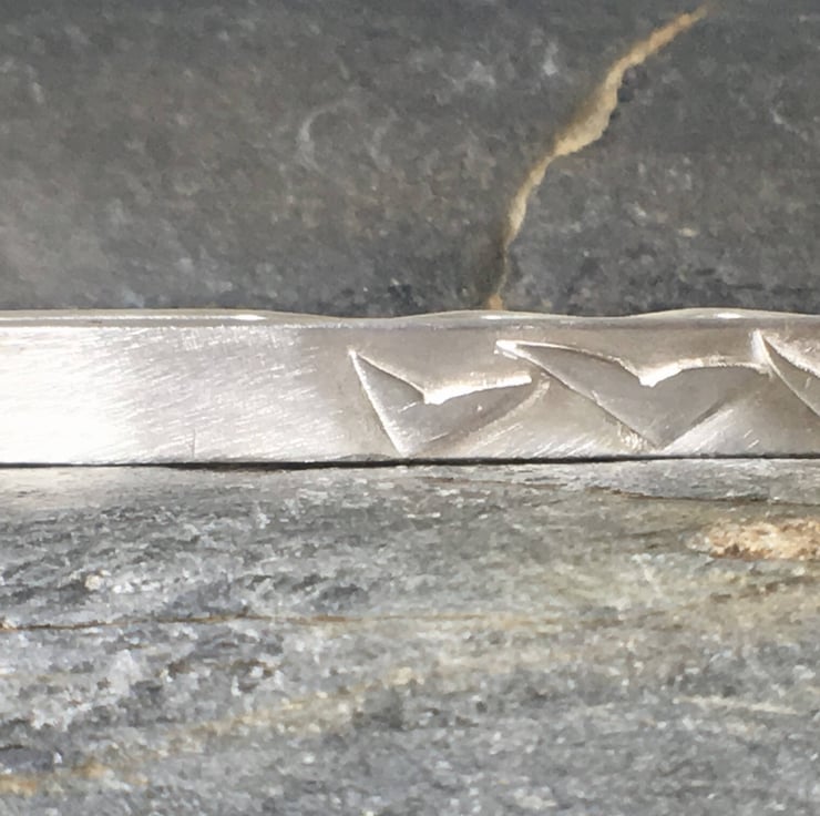 Hand stamping is created by the blow of a hammer on steel letter and number punches. It s not as precise as engraving and so irregularities and variations in the text are to be expected. Letters may not always be perfectly aligned and some letters may strike deeper than others. This is part of the charm of these designs and makes your jewellery uniquely yours.