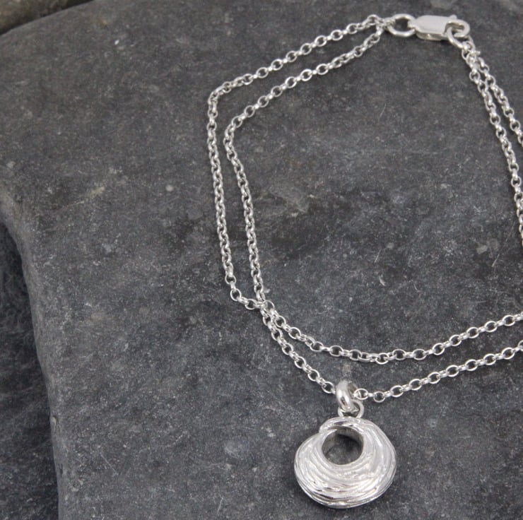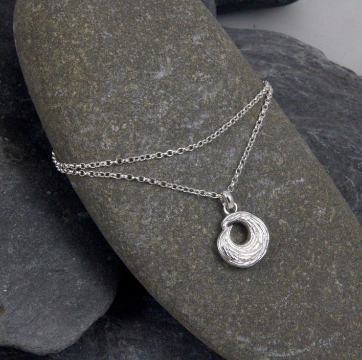 The bracelet is made from a belcher style chain and features a double strand. On to one of the chains, the charm threads. This leaves some free movement in the other, reminding me of the next wave about to roll in. Each charm is approx 1.4cm at its widest point and 2.1cm from the top of the bail to the base of the pendant. It has a polished finish, with some extra high shine detail on the edges of the charms ripples for added sparkle and to reflect the light just as the water does!
