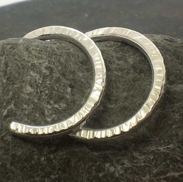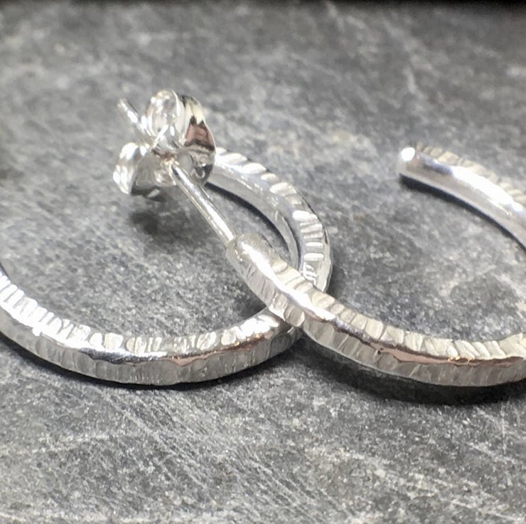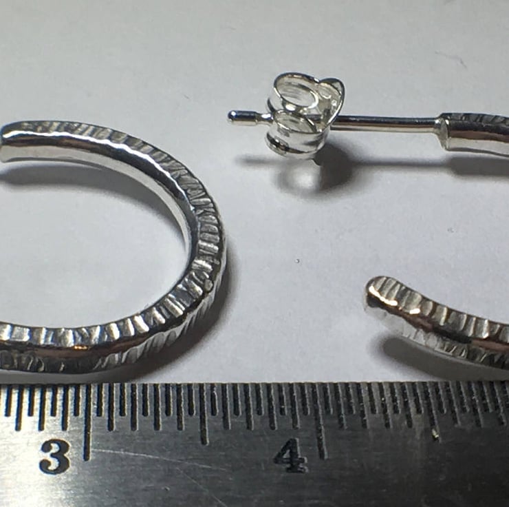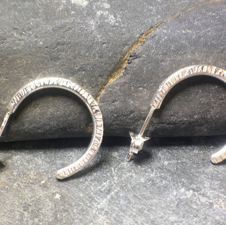 The earring is formed of a solid Sterling Silver wire, that has been shaped. It's then hammered to flatten it on 3 sides using the angle edge of the hammer. It's this organic texture that gives it the beautiful sparkle! At their widest point, these earrings measure 1.5cm (15mm) and have a Sterling Silver ear post and scroll back.
