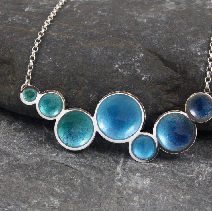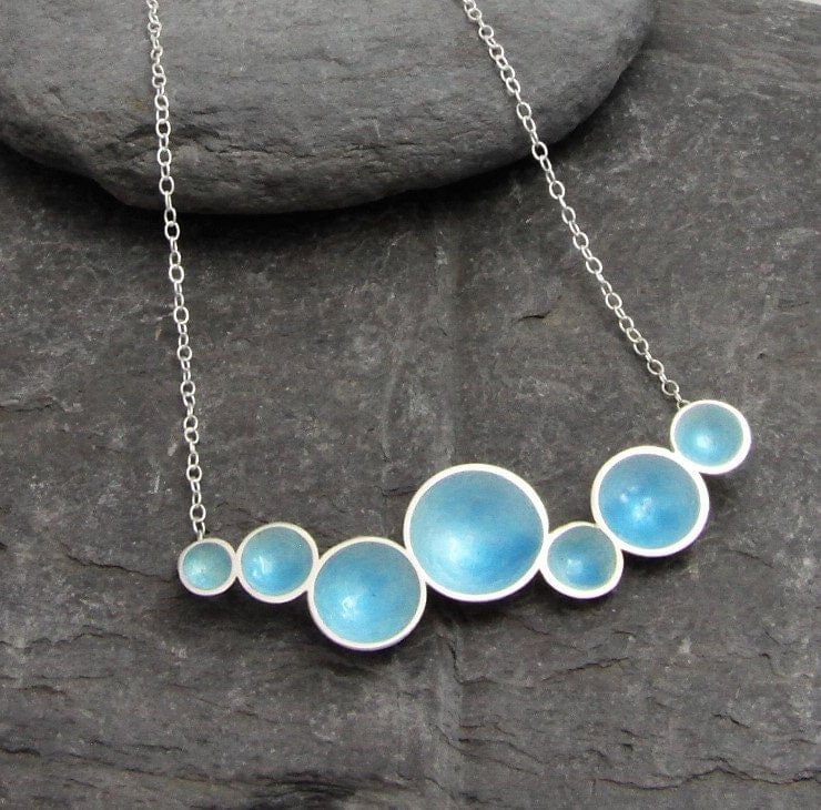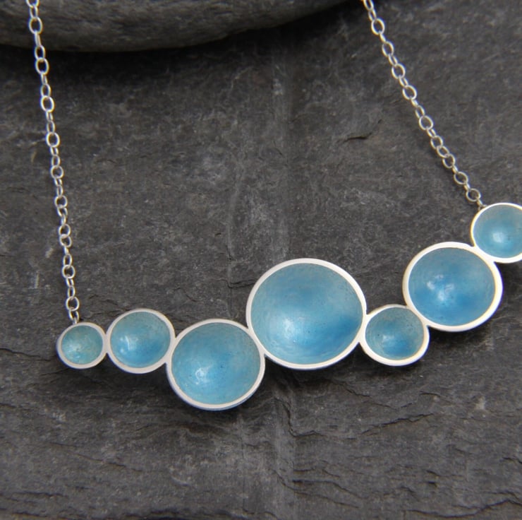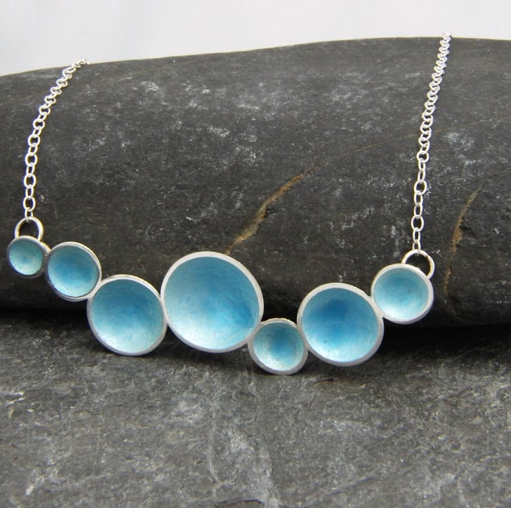 This necklace is formed of 7 discs of Sterling Silver that have all been shaped to form a cup. They are then soldered together at differing angles to represent the flow of the water, which is never regular! The total necklace width is aprox 6cm and at it's tallest point, aprox 1.6cm. A 16 inch trace style Sterling Silver chain is attached to the back of the domes.