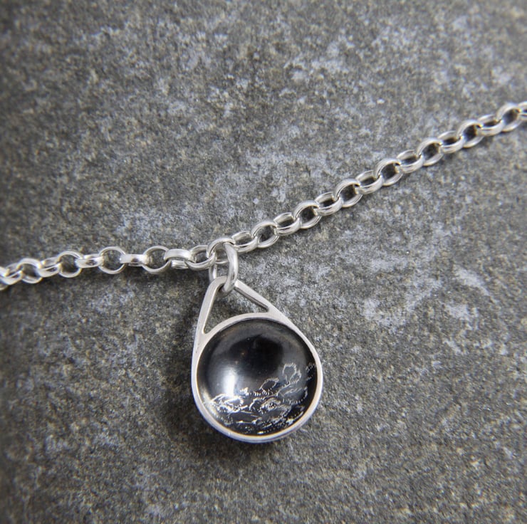 The edge of the dome is flat and has been polished for contrast against the inside of the blackened dome. The charm is presented in a fixed position on a belcher style chain, measuring 7.5 inches long (please get in contact if an alternative length is required). The back of the charm has been finished with a brushed texture, while the chain bracelet is polished.