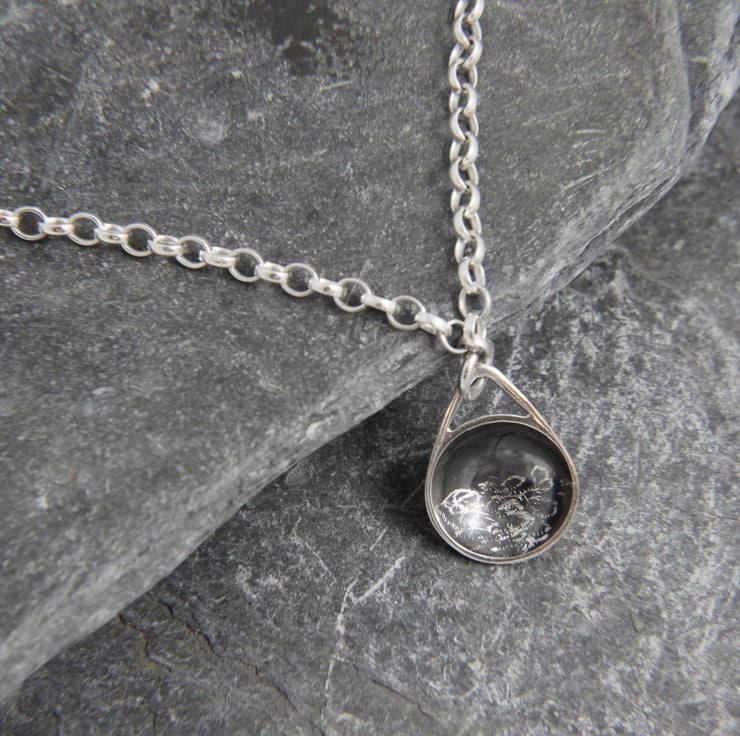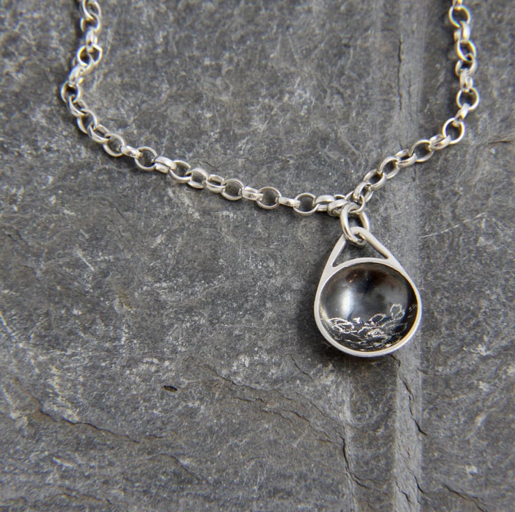 The inside of the dome has been treated with an oxidising treatment to blacken it, which has been lightly polished. The polishing process removes some of the colour and also gives it a sheen that changes the intensity of colour, just like a stormy sky! Half of the concave dome is then textured again and small sections of the blackened, polished surface are hand engraved to reveal the silver - it's this that is representative of the ferocious sea.