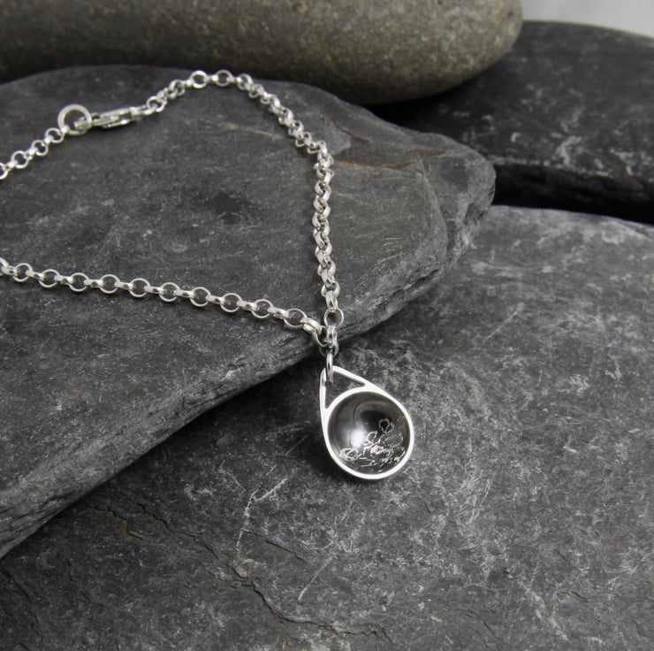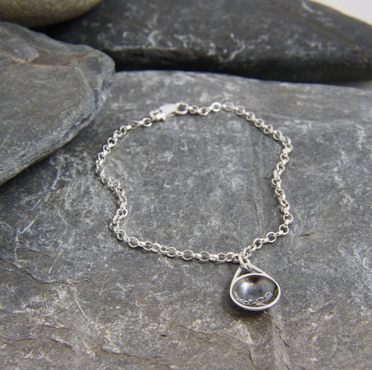 The edge of the dome is flat and has been polished for contrast against the inside of the blackened dome. The charm is presented in a fixed position on a belcher style chain, measuring 7.5 inches long (please get in contact if an alternative length is required). The back of the charm has been finished with a brushed texture, while the chain bracelet is polished.