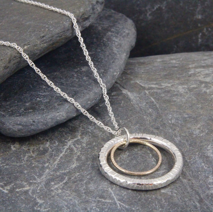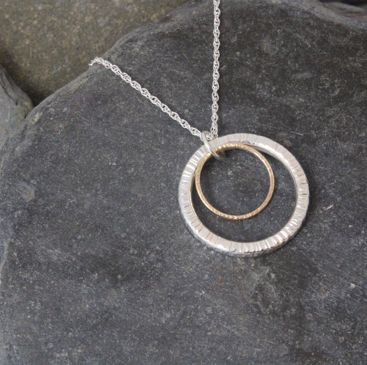 The outside diameter of the larger hoop, made from Sterling Silver is 2.5cm, it has the hammered texture applied to it and a squared edge. The diameter of the smaller circle, made from 9ct Yellow Gold is 1.5cm and also hammered with the same texture. This smaller hoop hangs in front or behind the larger as you choose. The two are joined by a jump ring which the chain threads through. The pendant is presented on an 18 or 16 inch rope style chain to complement it.