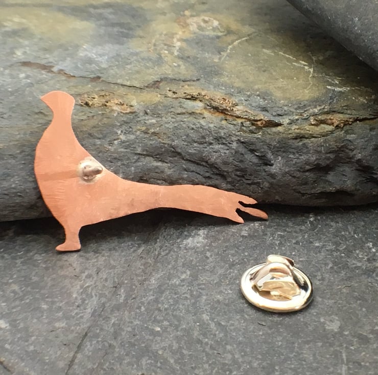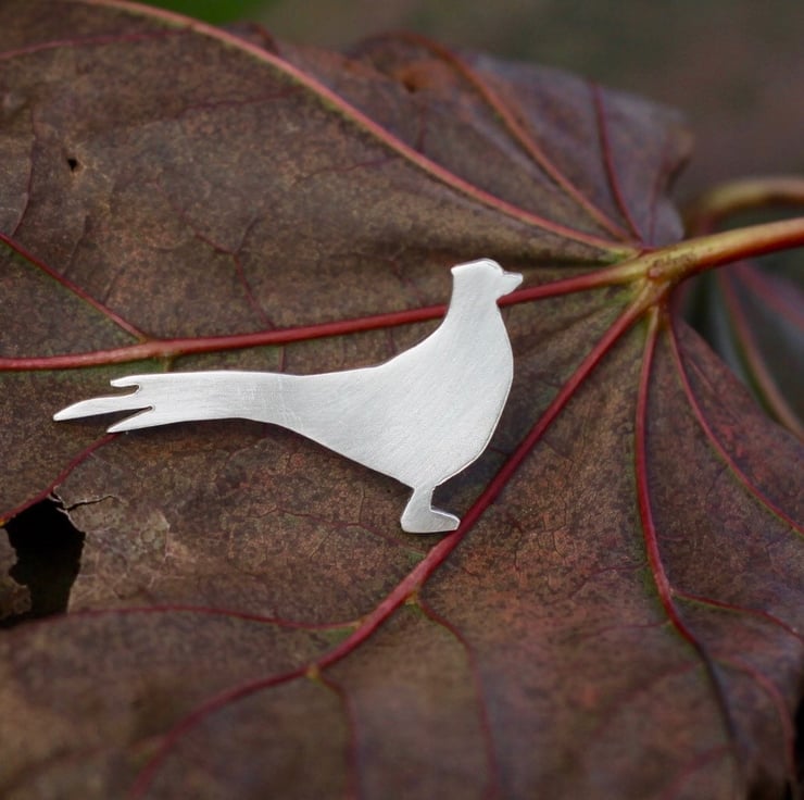 This pheasant is sawn from Sterling Silver or Copper and measures approx 40x35mm (4x3.5cm). As it's hand sawn, each pheasant will vary very slightly making it unique to you. The pin and clasp back are both made from Sterling Silver. The pin is finished with a brushed satin effect on both front and back.