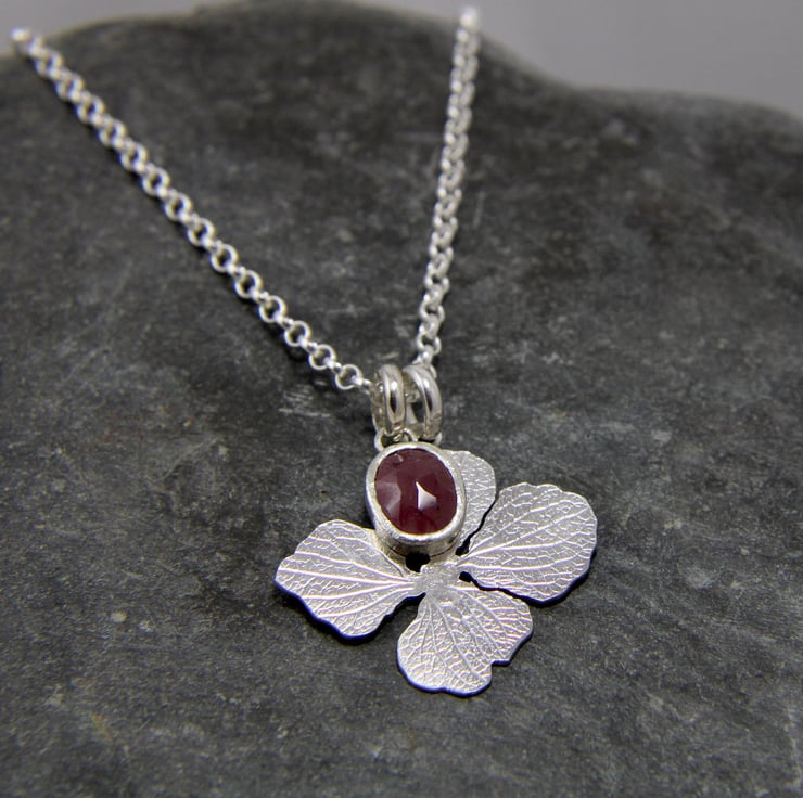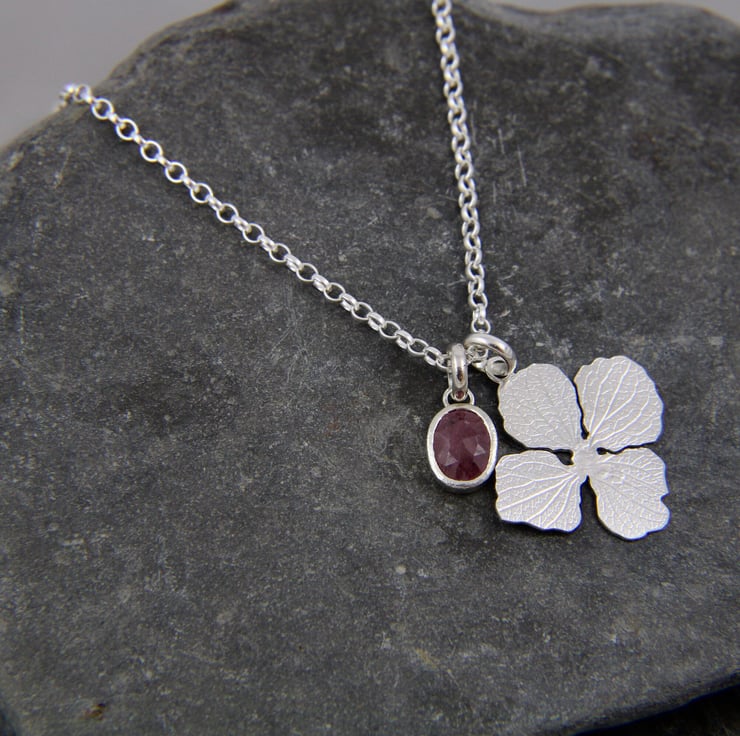Hydrangea Petal Sterling Silver and Ruby Necklace Pendant