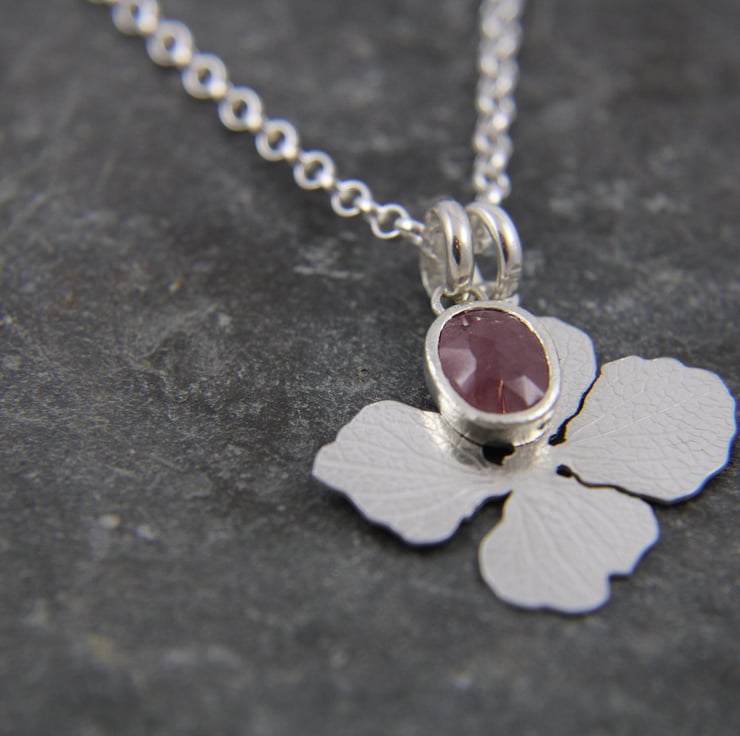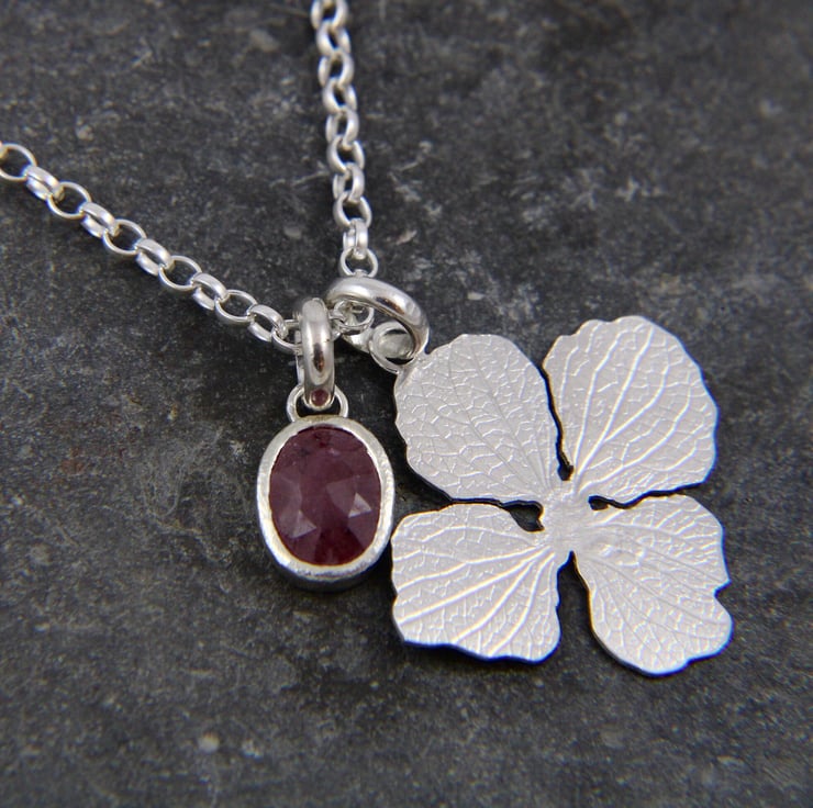 A second pendant is part of this design is a one of a kind gemstone from my own personal collection selected to reflect the colour of the Hydrangea bushes in full bloom in my garden and those same blooms eventually became these skeleton petals. A pink Ruby, set in a bezel style setting with a delicate, rustic textured pattern. The Ruby in its setting measures aprox 11x8mm. Ruby is July's birthstone and also the stone for 15th & 40th anniversaries. Rubies are said to be associated with prosperity, wealth and leadership. Both are presented on a Belcher style chain, length of your choice.
