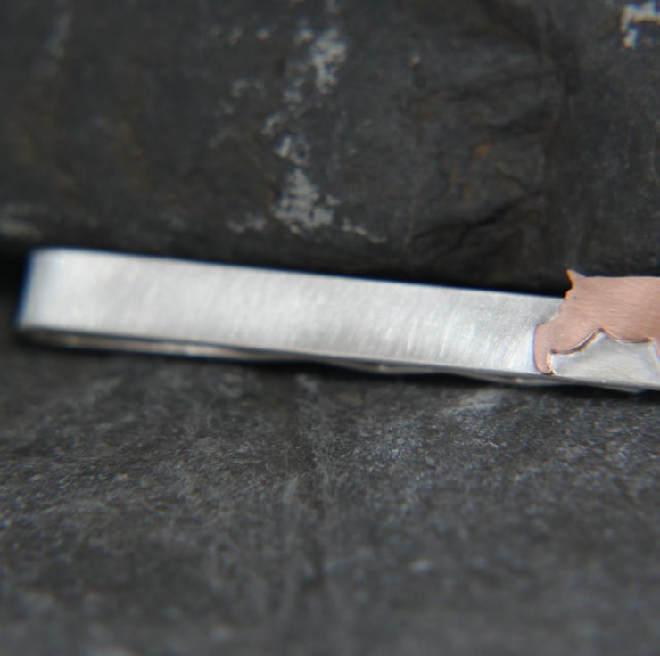The clip is made from Sterling Silver and measures 50mm (5cm) x 6mm (0.6cm). The Spaniel silhouette is hand cut from Copper or Sterling Silver, measuring aprox 5mm (1.5cm) by 11mm (1.1cm). It's then soldered to the clip, positioned to the far right of it, as if he were gazing up at you, waiting for your next command! The piece is finished with a brushed satin effect, which gives it a fantastic contemporary look. Alternatively, the Silver Spaniel can be treated with an oxidising solution that turns it black front and back.