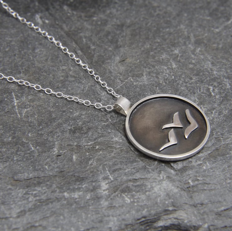 This circular pendant measures 2.3cm wide. The circular shape reminded me of their swirling dance. The pendant features a small flock of 3 birds, each bird is hand cut from Sterling Silver, no one is the same. They are positioned off centre and at different angles to give a sense of perspective , making each necklace one of a kind, just like a real flock of birds. The pendant has a squared edge to it, making the background recessed - the top edge of this is polished. The background is treated with an oxidising solution that turns it back and all shades from that to dark grey, just as I see in those storm clouds! The birds are polished, they shine bright and reflect the light beautifully, just as their feathers do on the crest of the hill. The remainder of the pendant, including the back and the bail is finished with a brushed texture, as a beautiful contrast to the polish and oxidised elements.