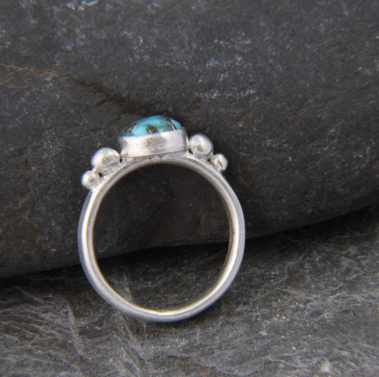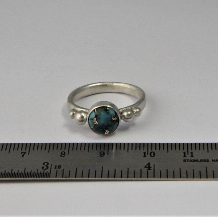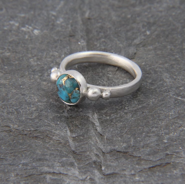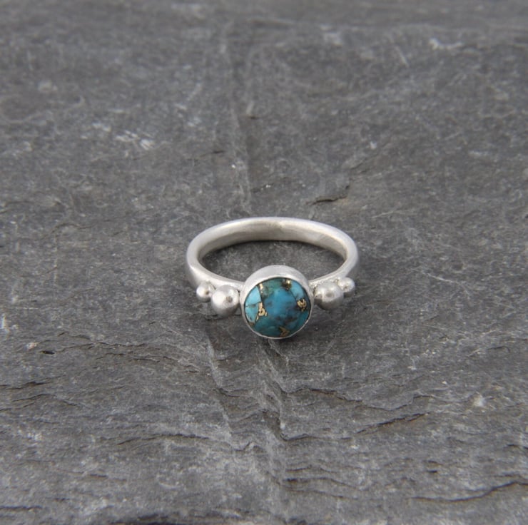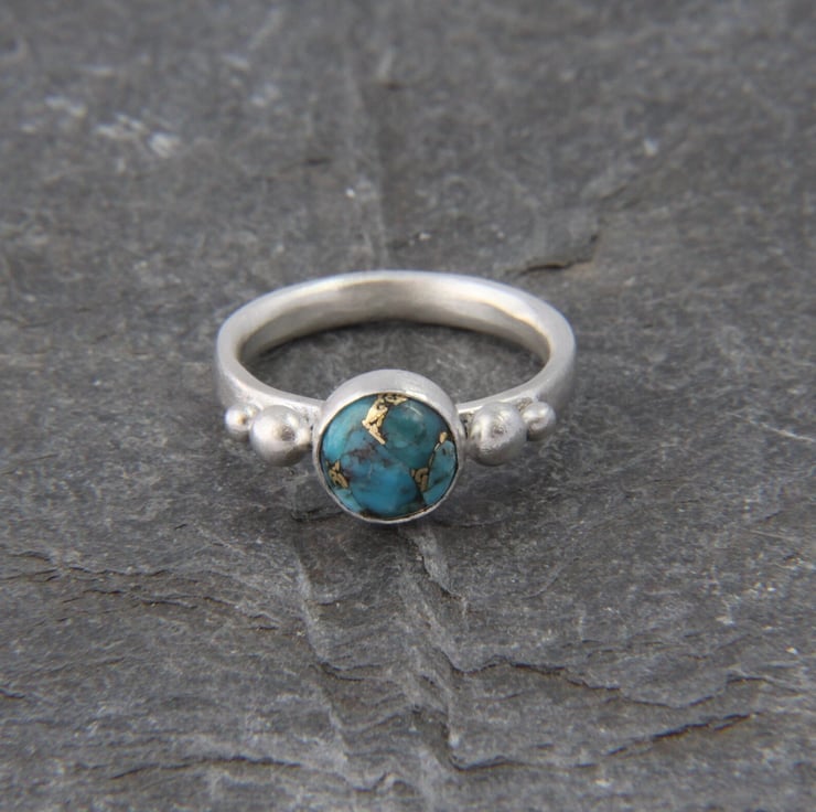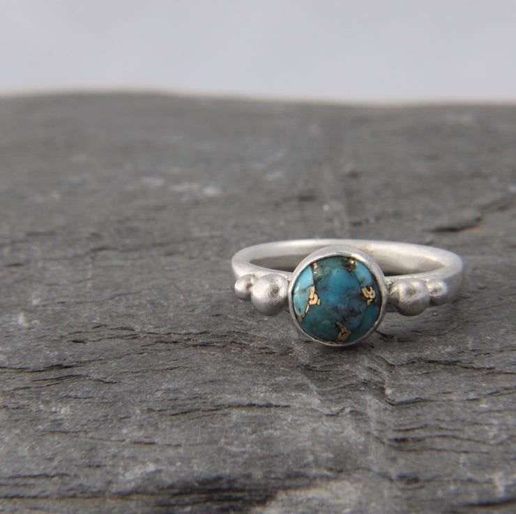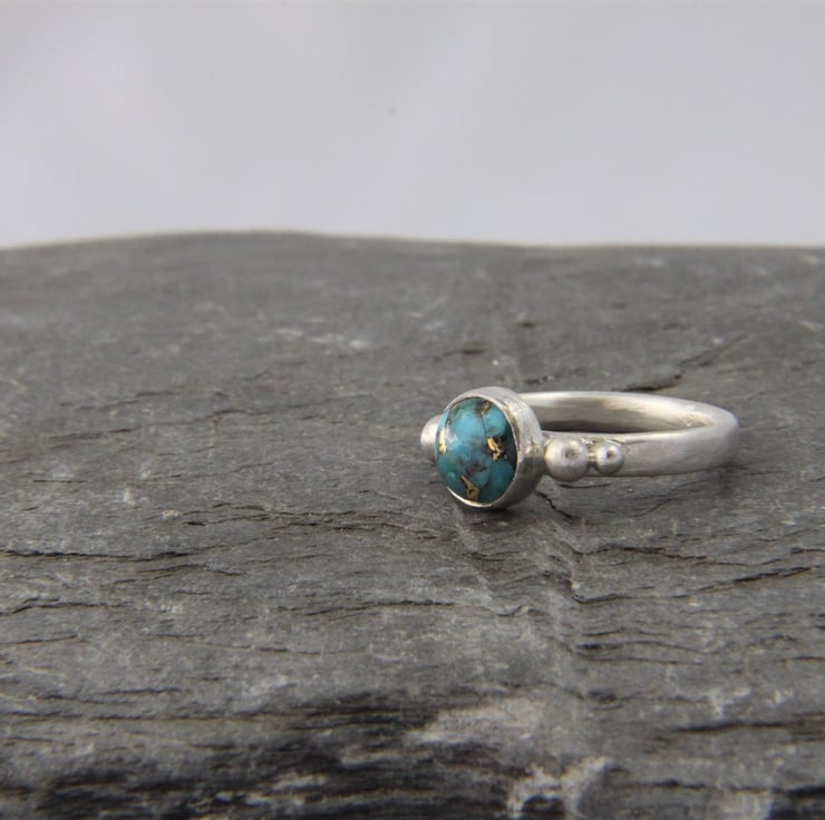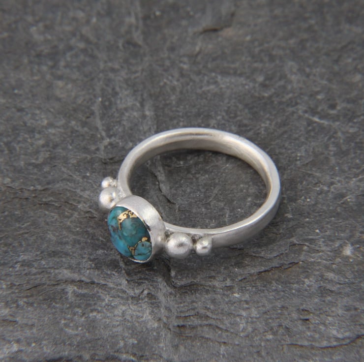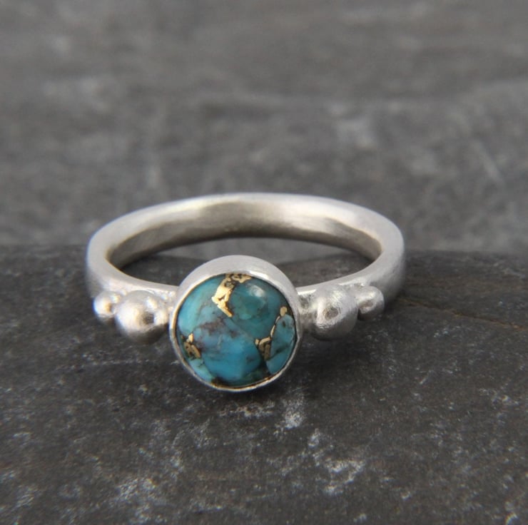 This solid Sterling Silver ring showcases a beautiful round Turquoise stone with stunning copper vein detail. Each stone is completely unique, one of a kind and measures 8mm diameter. It has been set in a bezel style setting, either side of which are recycled silver granules - these are naturally formed when silver is melted. The ring band, sized to your choice, is made from an oval shaped wire and the whole ring has been given a frosted satin texture, which shimmers like the water on a summers day!