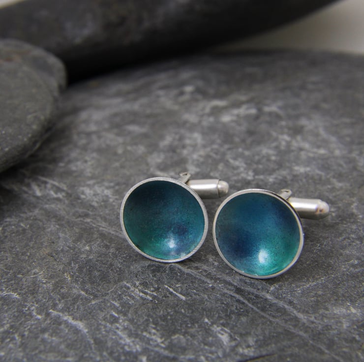 The edges of the the pools are filed flat and polished giving it a beautiful contemporary feel and helps draw the eye in! The back of it and the cufflink arm has a light brushed texture. The enamelled cup of each cufflink is approx 17mm wide.