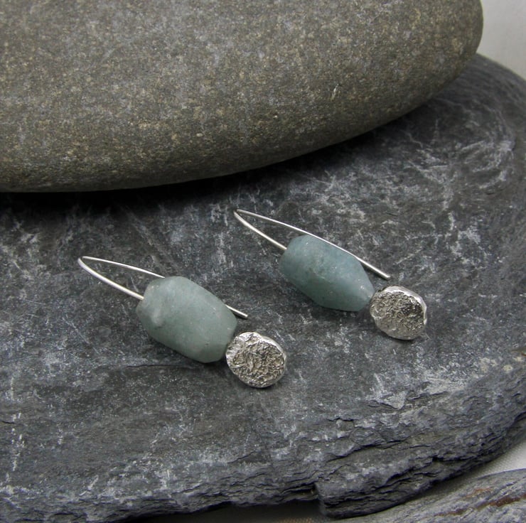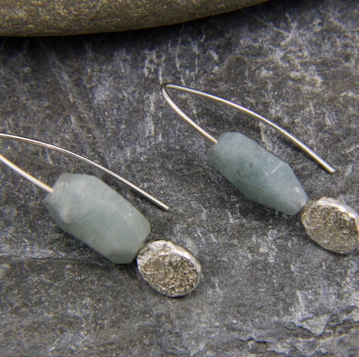 These earrings are made from Sterling Silver. The bead spins freely on the ear wire, but is held securely on the shaped wire that threads through your ear. Under the bead, a nugget of recycled Silver that bares the imprint of a beach pebble and creates a secondary focal point. The nugget measures 1.1cm by 0.9cm.