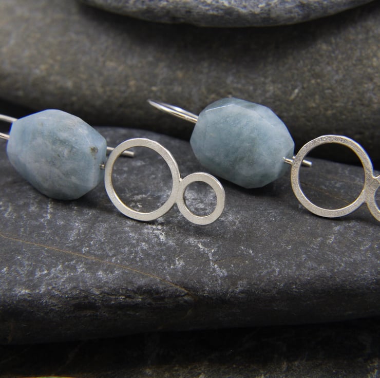 These earrings are made from Sterling Silver. The bead spins freely on the ear wire, but is held securely on the hoop shaped wire that threads through your ear. Under the bead, two hoops, soldered together join as the focus of the design. The larger circle measures 1.5cm diameter, the smaller 0.9cm diameter, have both been finished with texture reminiscent of wet sand glistening in the sunshine.