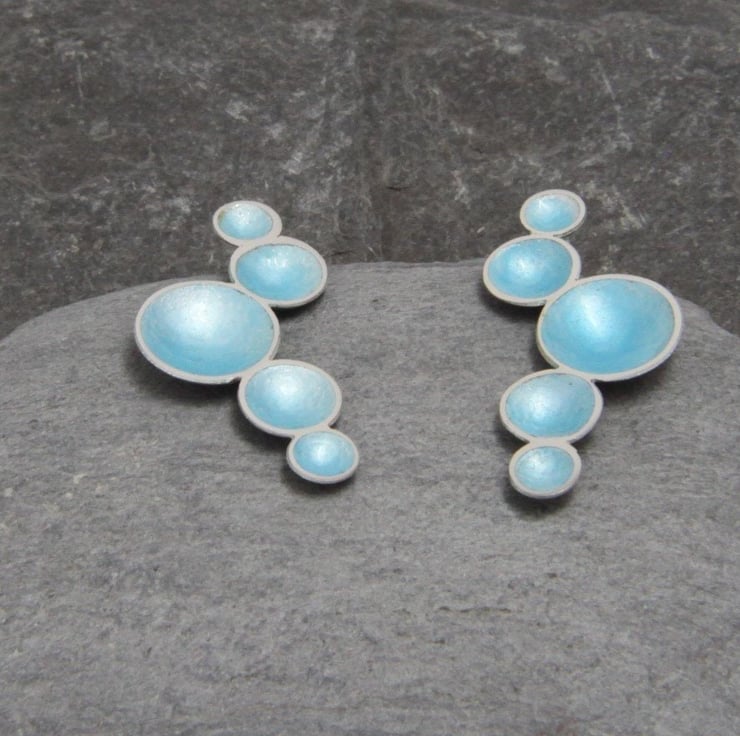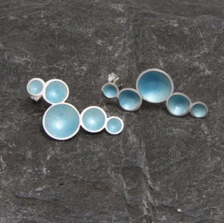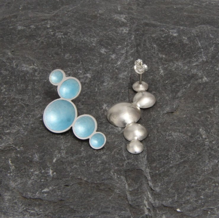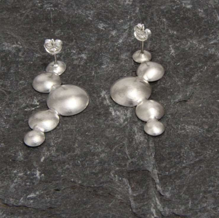 Each earring is formed of 5 discs of Sterling Silver that have all been shaped to form a cup. They are soldered together at differing angles to represent the flow of the water, which is never regular! The total earring length is aprox 3.6cm and at it's widest point, the earring is 1.5cm. The earrings attach to the ear via a Sterling Silver ear post on the back, fixed with a scroll back.