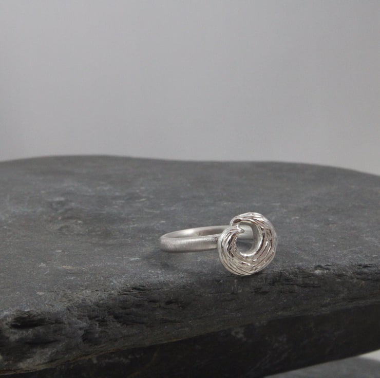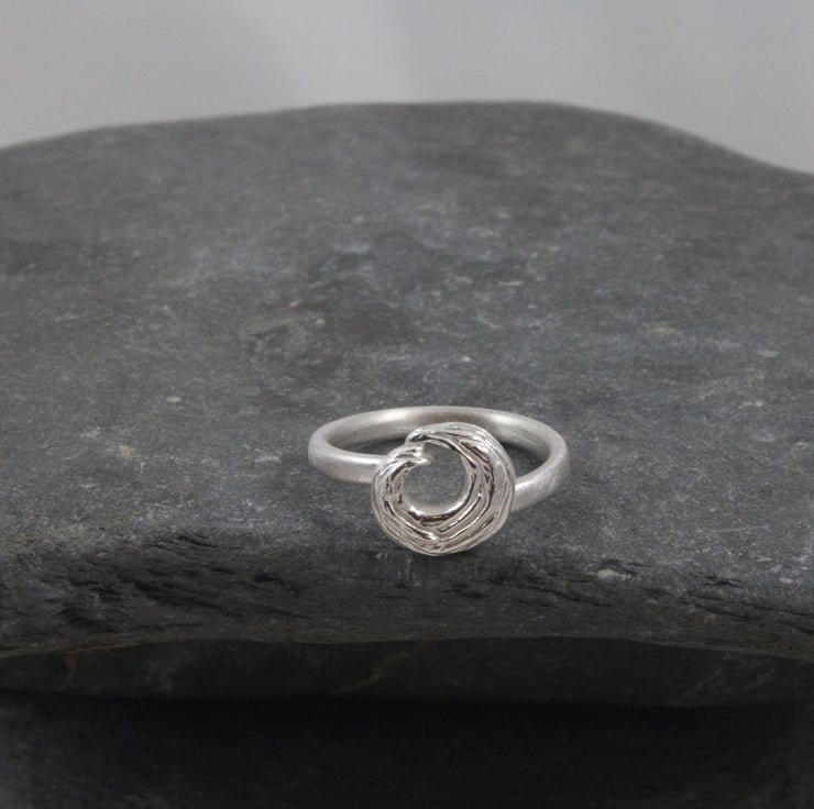 The ring band is made from an oval shaped wire. It's an asymmetric band, attaching to the wave at different points and further giving the feeling of movement. The wave detail measures 1.1cm at its widest point and 1 cm at its tallest. It has a polished finish, with some extra high shine detail on the edges of the charms ripples for added sparkle and to reflect the light just as the water does! The band has been given a brushed finish which gives even more focus to the detail of the wave. This ring will be made to order for your perfect fit!