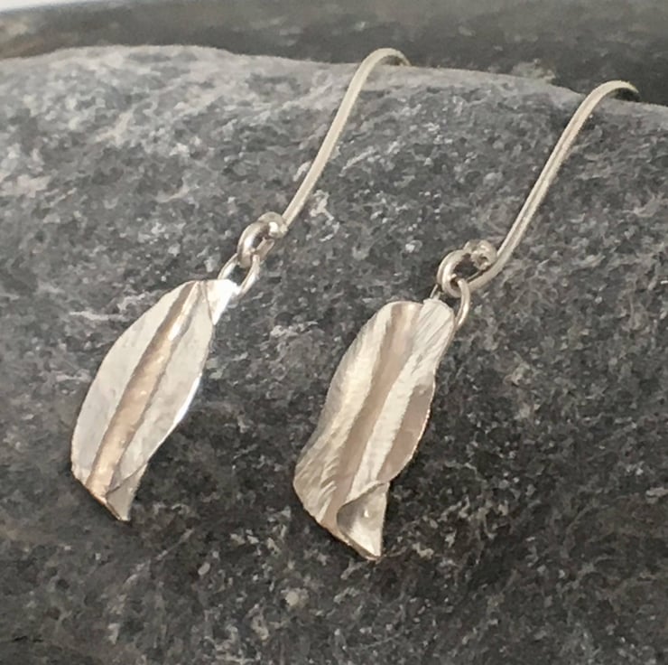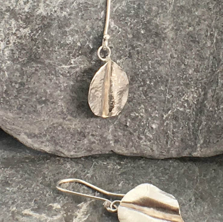 Each leaf is made from Sterling Silver and individually hand forged using a traditional silversmith technique called Fold Forming. This technique produces one of a kind unique, but realistic leaves. Each leaf measures approximately 15mm (1.5 cm) at it's tallest point and 10mm (1cm) at the widest point. The leaves are hung on a handmade ear wire with the drop measuring aprox 20mm (2cm). The leaf attaches to the wire via a small ring at the top of the leaf, meaning that they dangle as you move, just as the leaves in the hedgerows dance in the breeze.