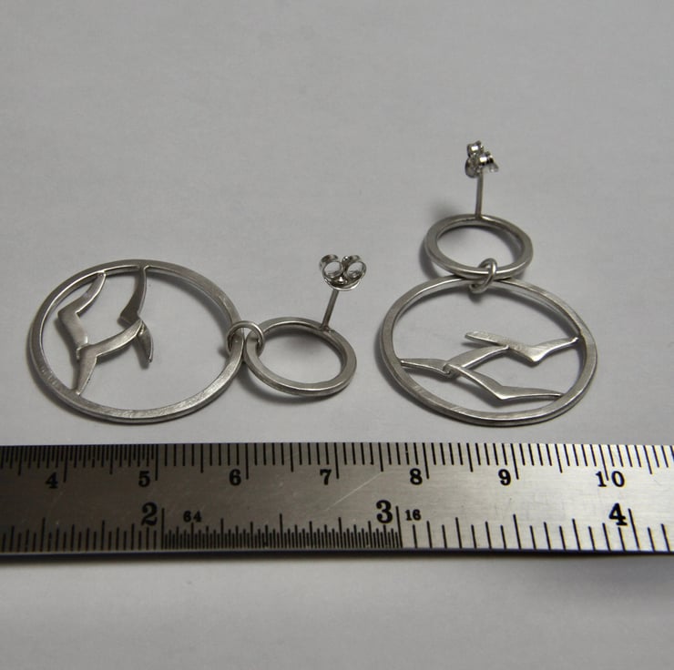 Each earring features three birds hand cut from Sterling Silver, making each one unique from another. They are positioned at differing angles within the large circle to give a sense of realism. The two circles are joined by a small jump ring, allowing the larger one, that contains the birds to move freely just as the real ones do on top of the cliff! The small circle has a simple pin and scroll back fixing for comfortable wear. Both the front and back of the earrings are finished with a brushed texture.