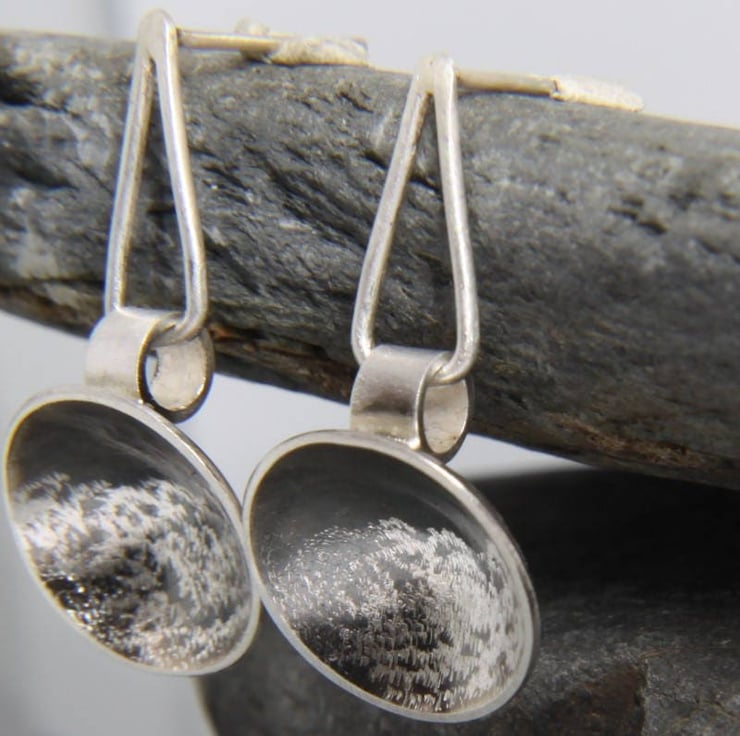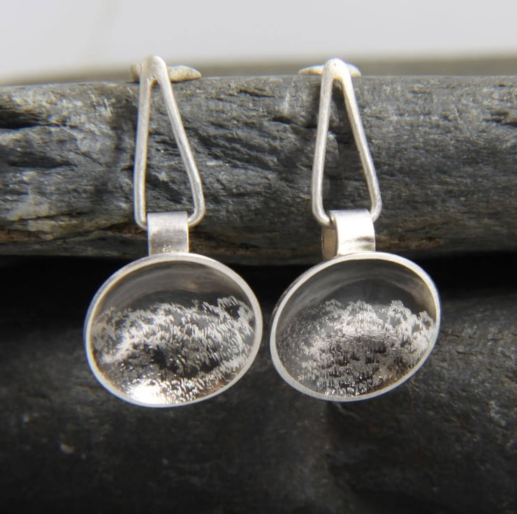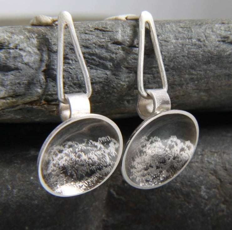 The inside of the domes have been treated with an oxidising treatment to blacken it, which has been lightly polished. The polishing process removes some of the colour and also gives it a sheen that changes the intensity of colour - depending on which direction you look at it, it looks various shades of grey and black, just like a stormy sky! Half of each concave dome is then textured again and small sections of the blackened, polished surface are hand engraved to reveal the silver - it's this that is representative of the ferocious sea. A small piece of sterling silver tube attaches to the back of the dome. A triangular style drop, with a brushed texture attaches through this tube, creating a contemporary style drop dangly earring. The triangular drop measures aprox 1.5cm (15mm) tall and 0.5cm (5mm) wide, making the entire earring length aprox 2.9 cm (29mm).