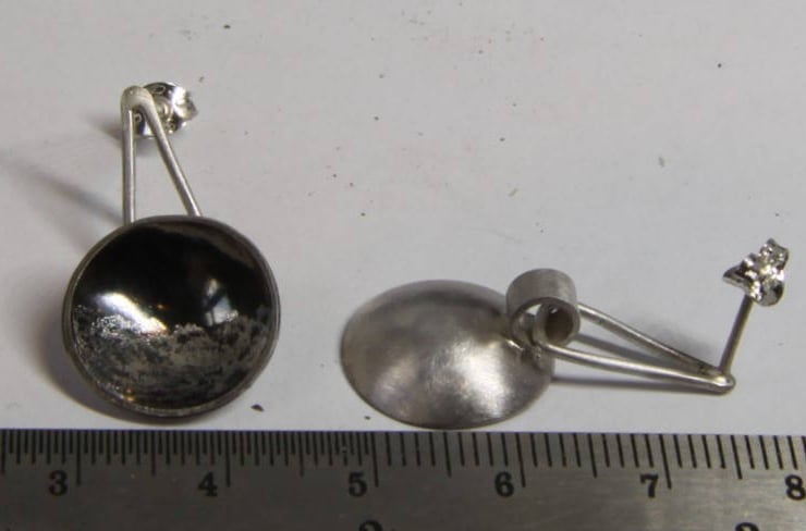 The edge of the domes are flat, front facing and have been polished for contrast against the blackened insides. The earrings have a sterling silver ear post style attachment and scroll back. The back of the these drop earrings is finished with a brushed texture.