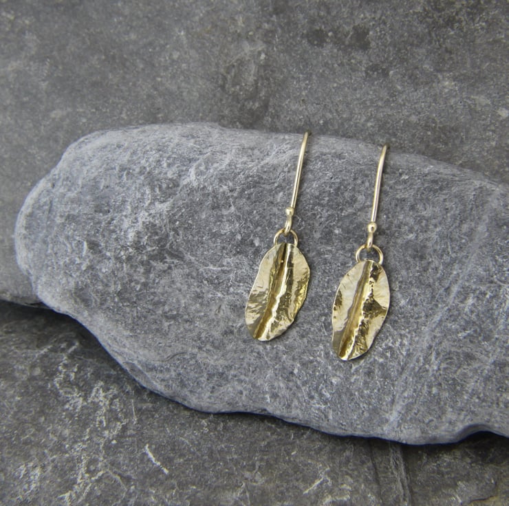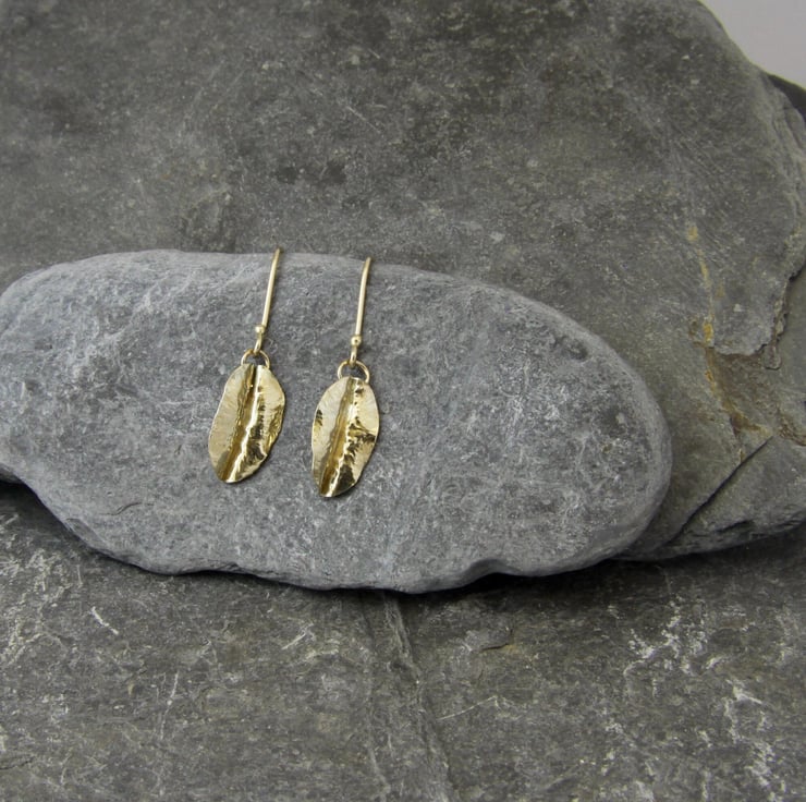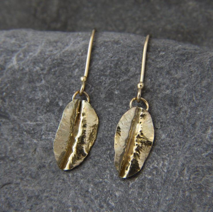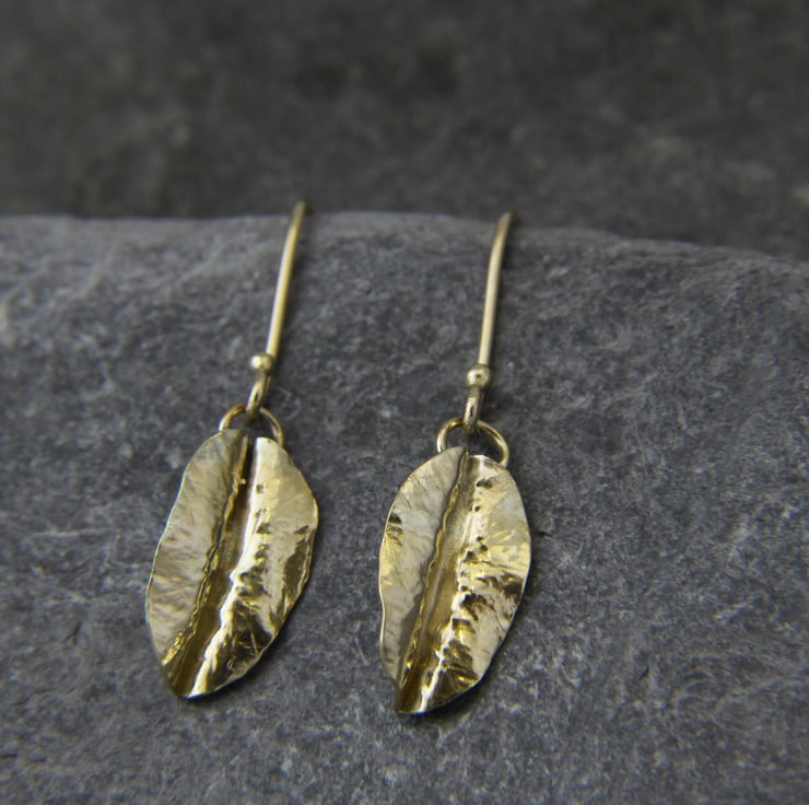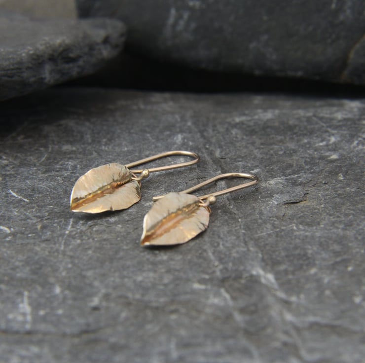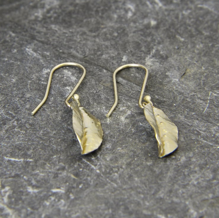 Each leaf is made from 9ct Gold individually hand forged using a traditional silversmith technique called Fold Forming. This technique produces one of a kind unique, but realistic leaves. Each leaf measures approximately 15mm (1.5 cm) at its tallest point and 10mm (1cm) at the widest point. The leaves are hung on a handmade ear wire. The leaf attaches to the wire via a small ring at the top of the leaf, meaning that they dangle as you move, just as the leaves in the hedgerows dance in the breeze.