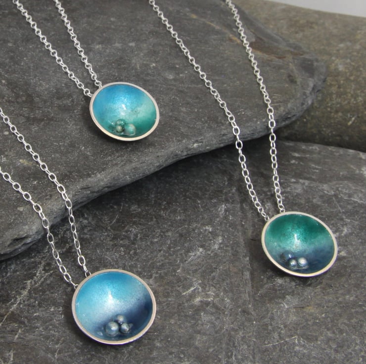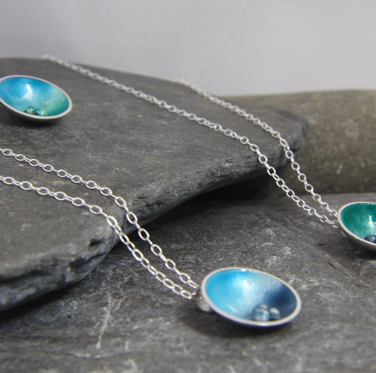 Within each pendant are 3 small granules of silver - when silver is heated in small quantities, but forms a molten ball or granule. These granules represent the rocks at the bottom of those beautiful pools and sit beneath the enamel just as they sit beneath water on the beach. The colour is added by using powdered enamel that is hand fired. The process of hand firing means that no pool is identical - there are beautiful variances in the colour, giving the earrings a wonderful sense of realism!