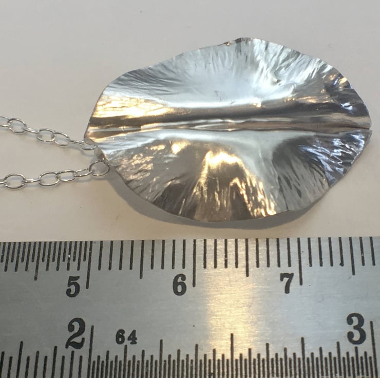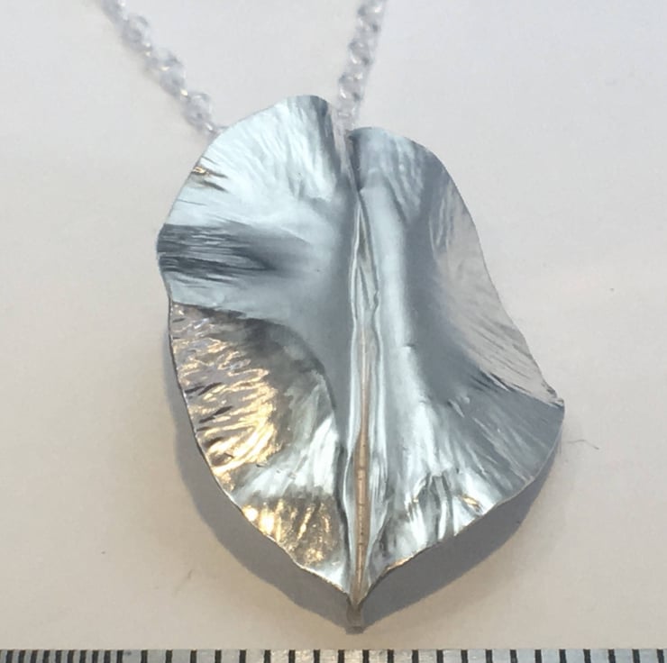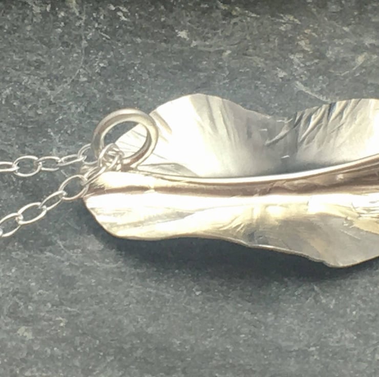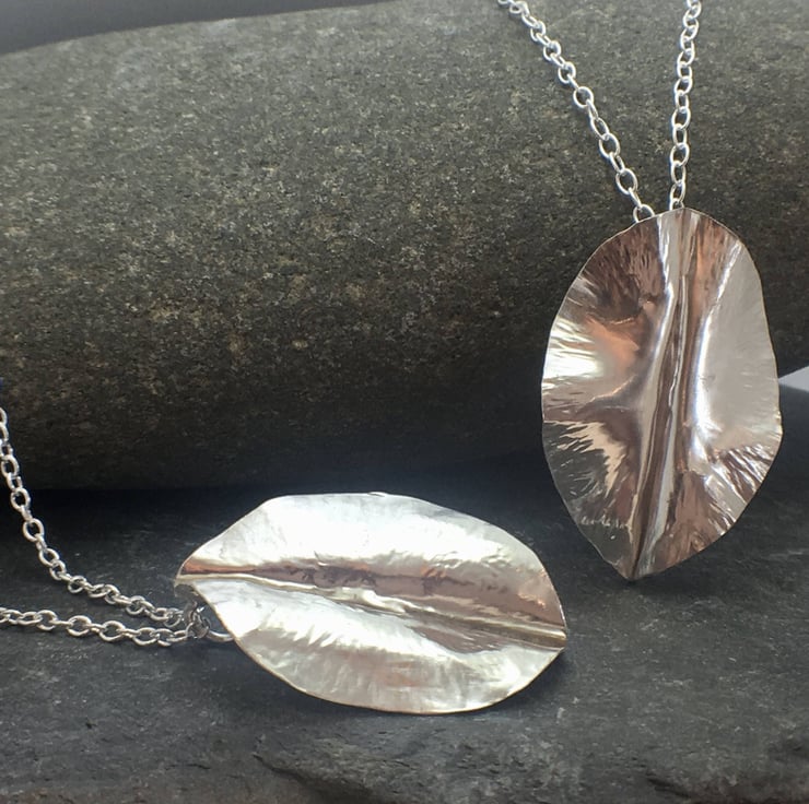 Each leaf is made from Sterling Silver and individually hand forged using a traditional silversmith technique called Fold Forming. The leaves will vary very slightly because each one is one of a kind and totally unique. They measure approximately 30mm (3 cm) by 20mm (2cm) and are presented on a trace style chain, with a choice of 16 or 18 inch.
