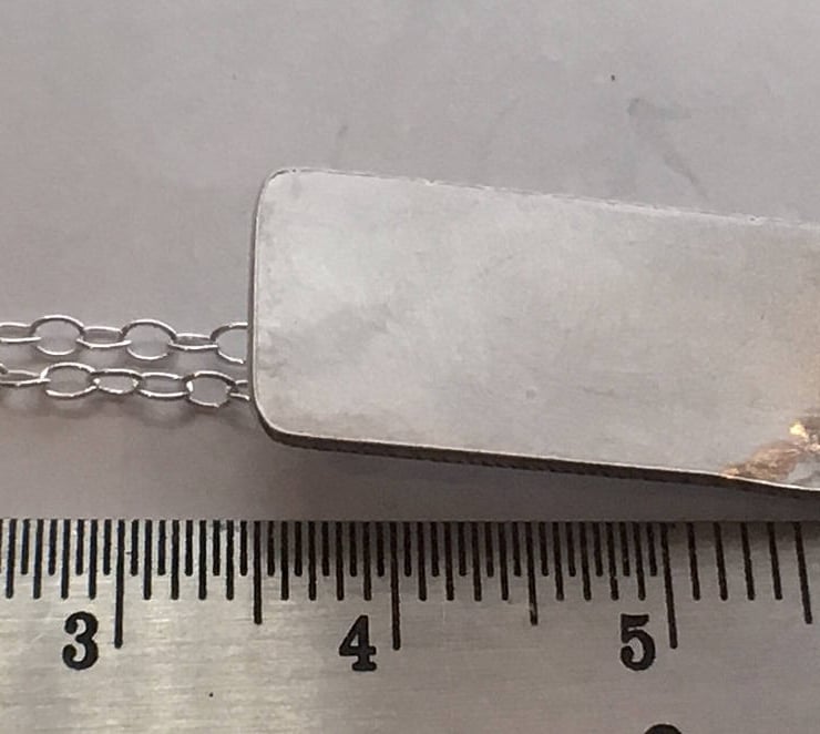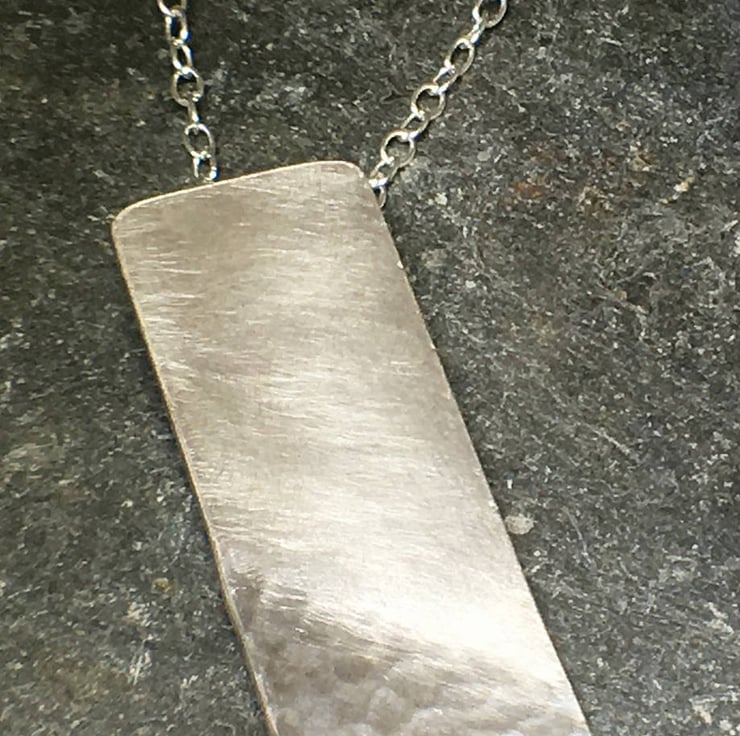 The rectangle is cut from Sterling Silver and measures approx 1.2cm wide and 3.5cm tall. Half of the rectangle has a hammered texture, with a high shine, depicting the reflection on the sea as the sun peers through the hazy clouds. The remaining half has a light brushed finish that merges with the high shine hammered texture just as the horizon merges the sea to the hazy sky. The back is finished with a brushed texture. The necklace pendant is presented on a Sterling Silver trace style chain (your choice of 16 or 18 inch).