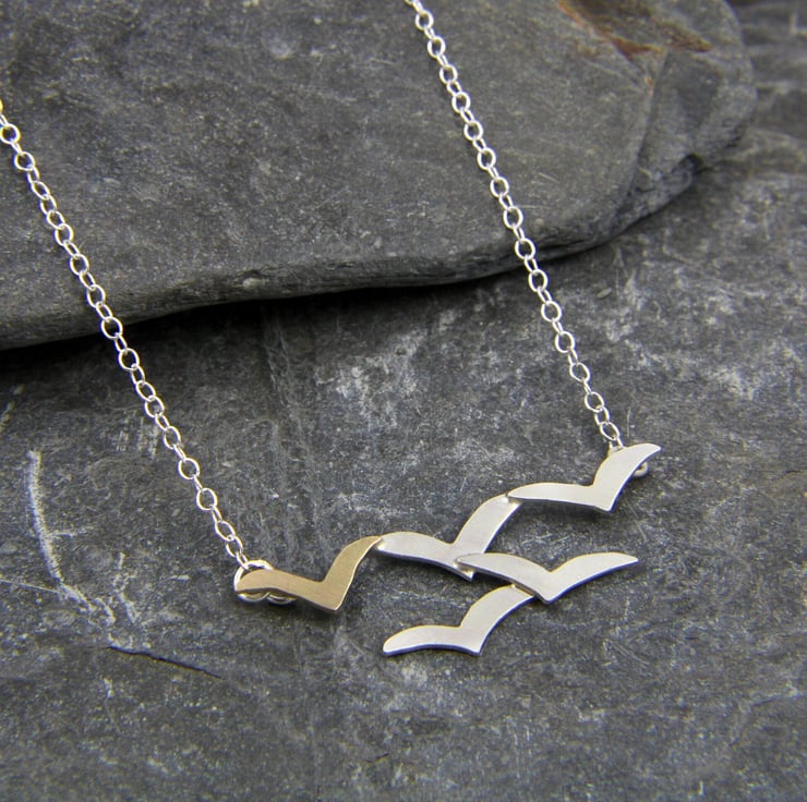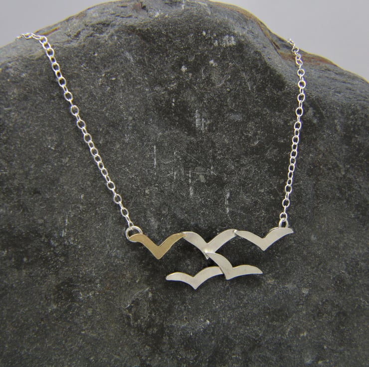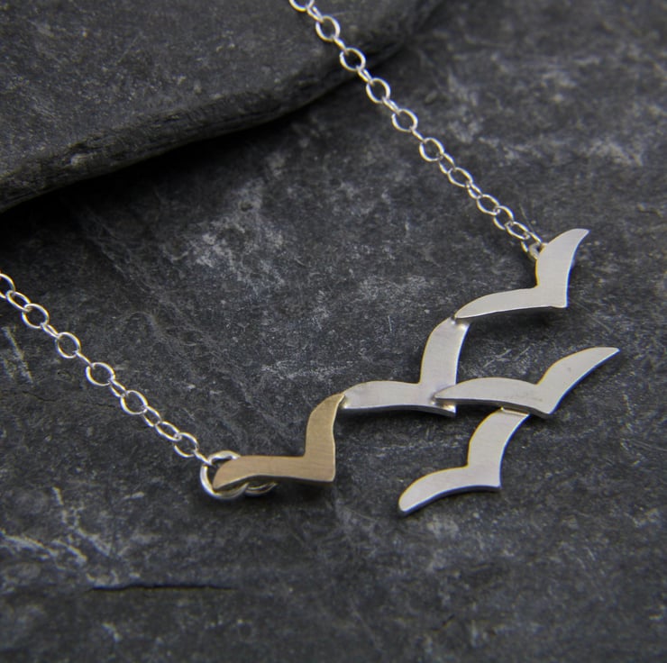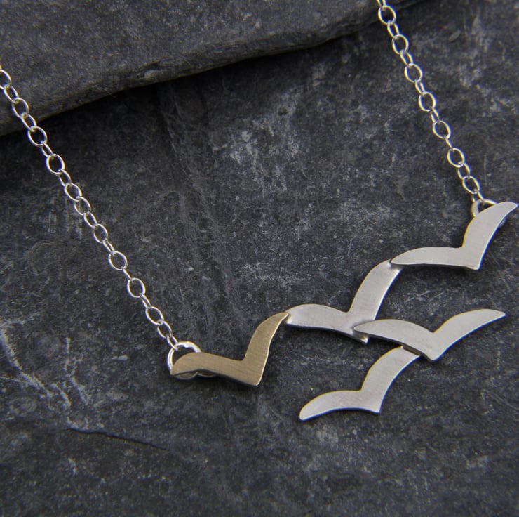 Each one of these necklaces is unique from another. Four of the birds will be hand cut from Sterling Silver and one from 9ct yellow Gold, no one is the same. The individual birds are then selected to create the flocks of 5 birds and soldered in to position, with the 9ct Gold one being on the top row of the flock at the end. The result is a one of a kind necklace, where just like a real flock of birds, no one is the same!
