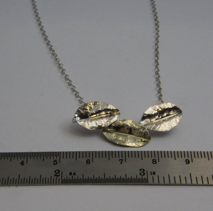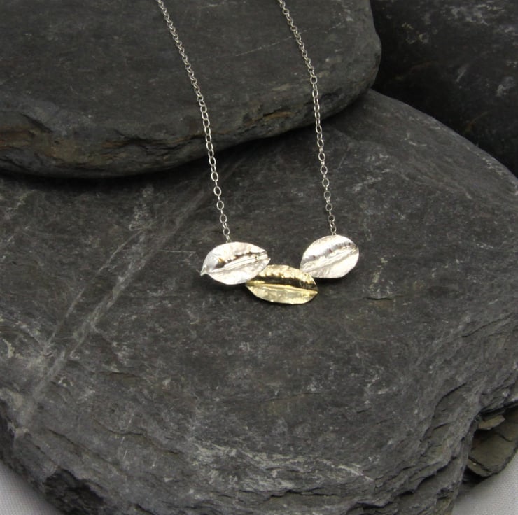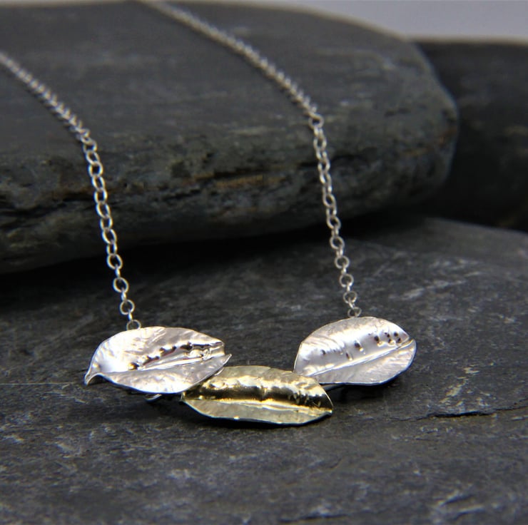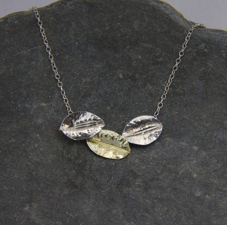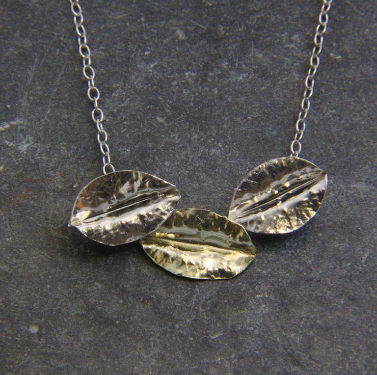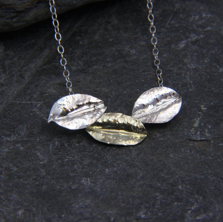 The necklace is formed of 3 leaves, all individually hand forged using a traditional silversmith technique called Fold Forming. Two of the leaves are made from Sterling Silver, the third from 9ct Gold. Each leaf is one of a kind, totally unique. The design has a lovely natural feel to it, not only because of the individually made leaves, but also their positioning at differing angles. The whole piece measures aprox 1.7cm at its tallest point and 3.5cm at its widest point. The necklace is presented on a fixed length, Sterling Silver Trace style chain, measuring 16 inches and finished with a beautiful soft satin polish on both the front and back.