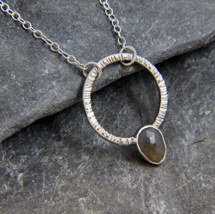 The pendant attaches to a trace style chain measuring 16 inches via rings that connect it to the large textured ring. There's a lovely organic movement to the pendant as a result of the this.