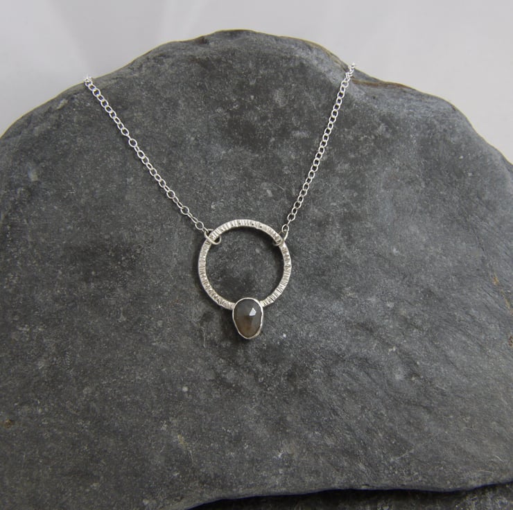 The pendant attaches to a trace style chain measuring 16 inches via rings that connect it to the large textured ring. There's a lovely organic movement to the pendant as a result of the this.