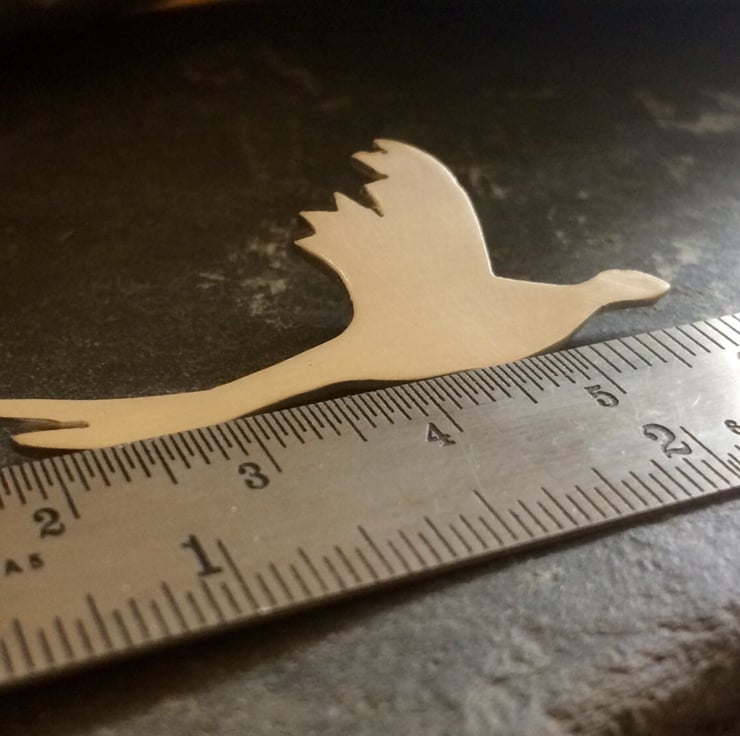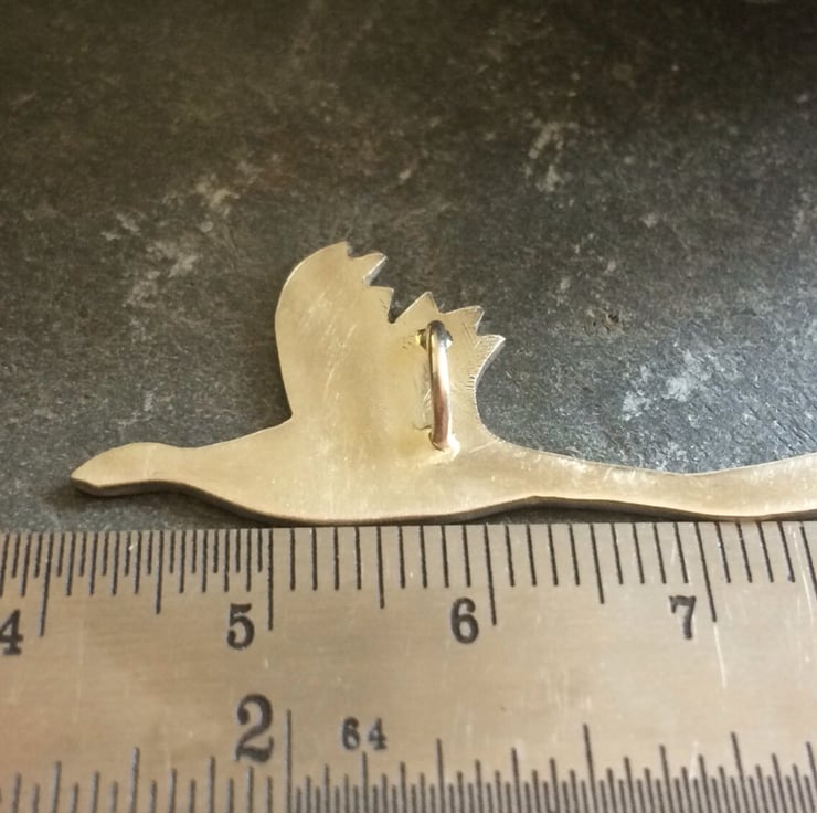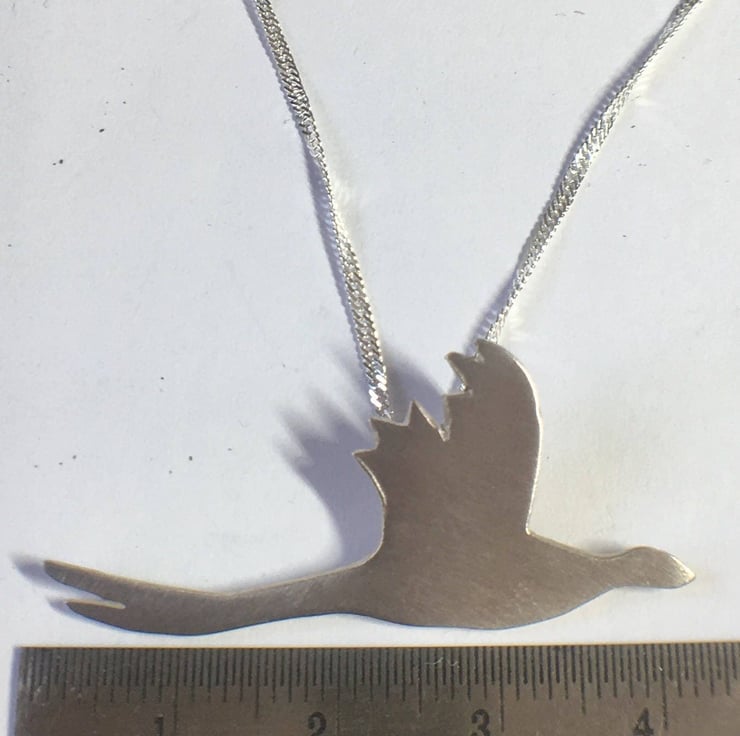 The pheasant is made from Sterling Silver and measures approx 40x35mm (4x3.5cm). As it's hand sawn, each pheasant will vary very slightly making it unique to you. The pendant is presented on a choice of 18 or 16 inch Singapore style chain. It's finished with a brushed satin effect on both the front and back.