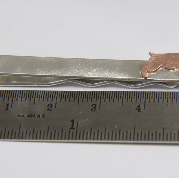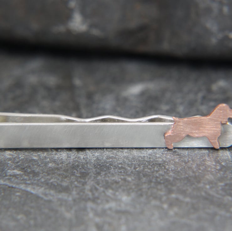 The clip is made from Sterling Silver and measures 50mm (5cm) x 6mm (0.6cm). The Spaniel silhouette is hand cut from Copper or Sterling Silver, measuring aprox 5mm (1.5cm) by 11mm (1.1cm). It's then soldered to the clip, positioned to the far right of it, as if he were gazing up at you, waiting for your next command! The piece is finished with a brushed satin effect, which gives it a fantastic contemporary look. Different metals and finishes can be used to personalise the silhouette.