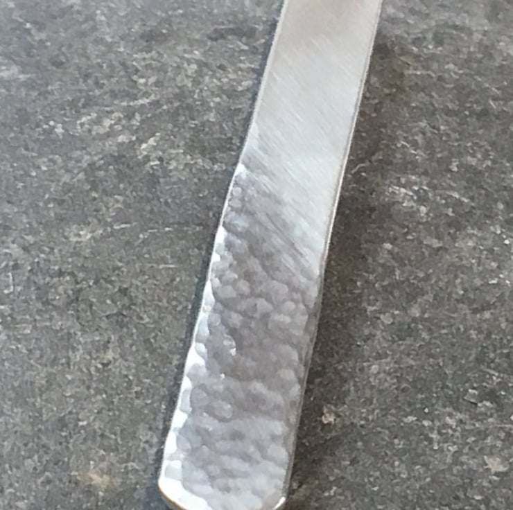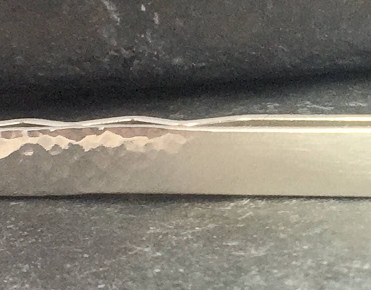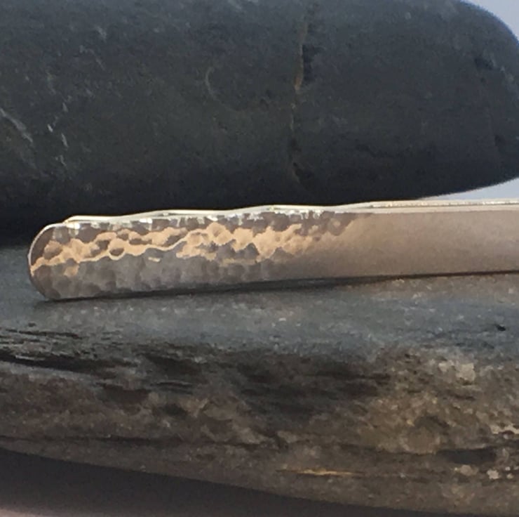 Half of the slide clip has a hammered texture, with a high shine, depicting the reflection on the sea as the sun peers through the hazy clouds. The remaining half has a light brushed finish that merges with the high shine, hammered texture just as the horizon merges the sea to the hazy sky. The back is finished with a brushed texture. The slide clip measures approx 50 mm (5cm) long and 6mm (0.6 cm) at its widest point.