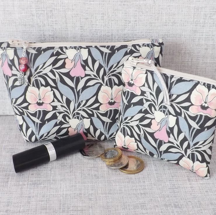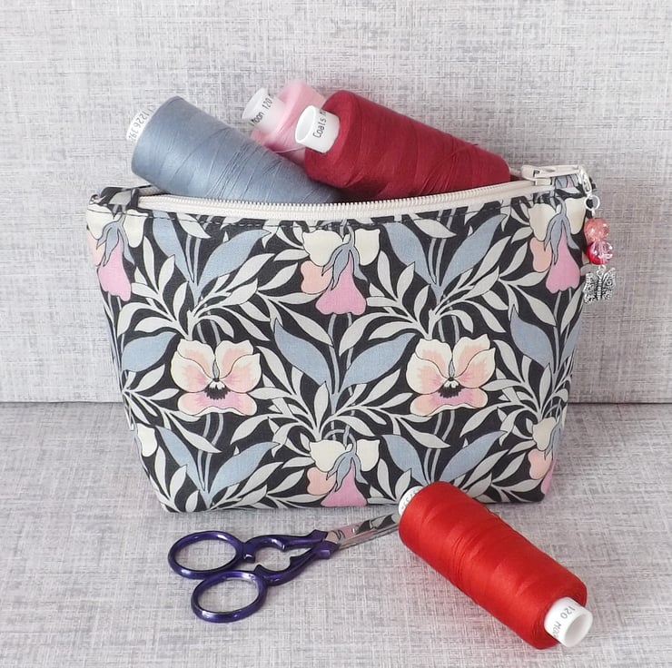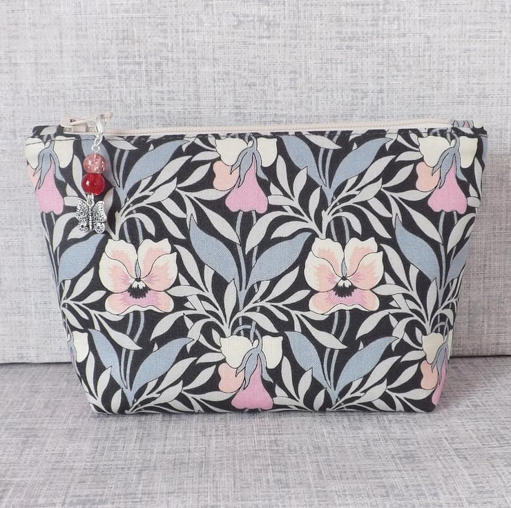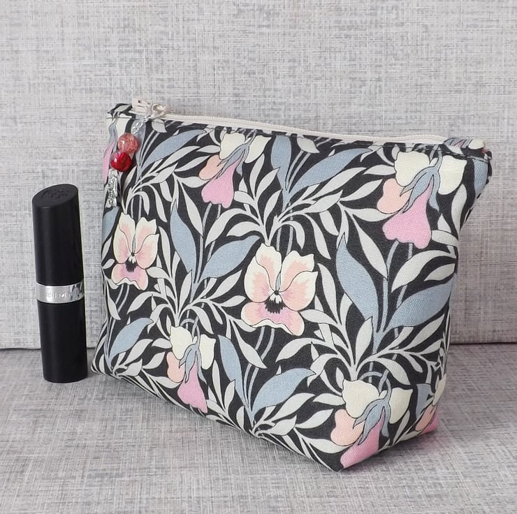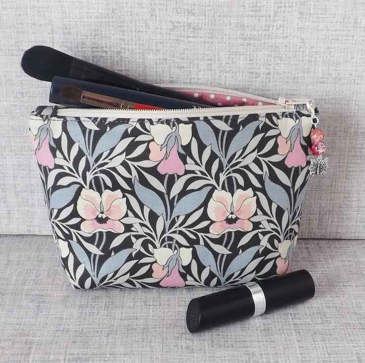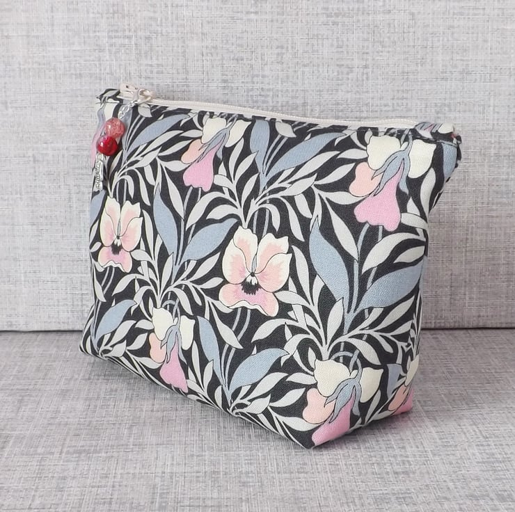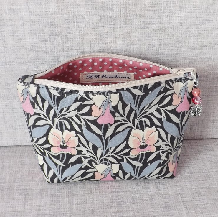 A medium sized make up bag made from a lovely cotton fabric. The main fabric is Liberty 'Harriet's pansy' from their Hesketh House range of quilting weight cotton, in shades of grey, cream and pink. The lining fabric is dusky pink colour cotton with white spots on it.