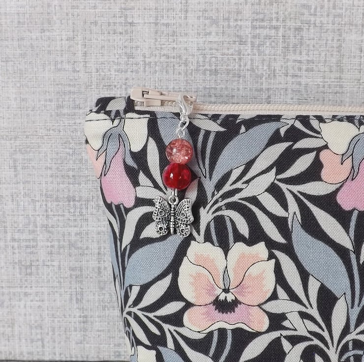 The fabric has been backed with fusible interfacing to give body to the bag, and there is a zip closure on the top with a bead & butterfly charm on the zipper pull.