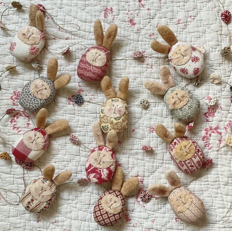 Three adorable miniature bunnies with bob tails, are threaded onto hemp twine, interspersed with 8 mini Suffolk puffs. The hemp has loops at the ends to assist with displaying. Hand stitched facial features and whiskers.