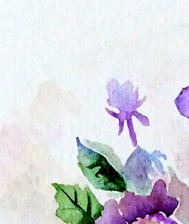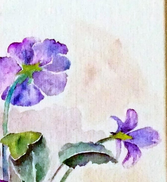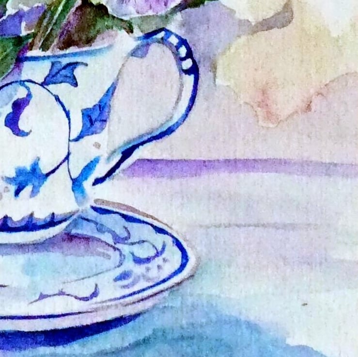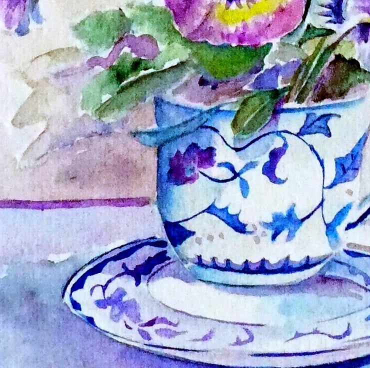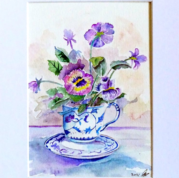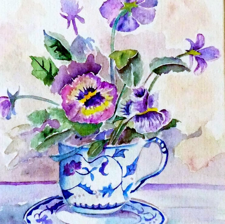 A small still-life watercolour of violas in a pretty porcelain tea cup.