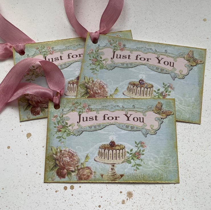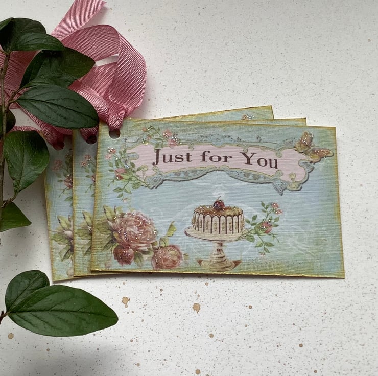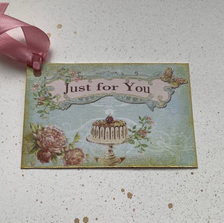 Lovely vintage-style images of gateau and roses. I have printed on to high quality linen-look (285gsm) card , and added the sentiment ' Just for You' . Of course there has to some shimmer! and so I have added the necessary glitter highlights .Finished with lovely ,silky , off-white ribbon !!