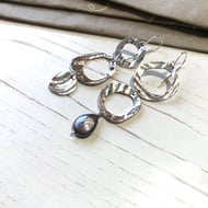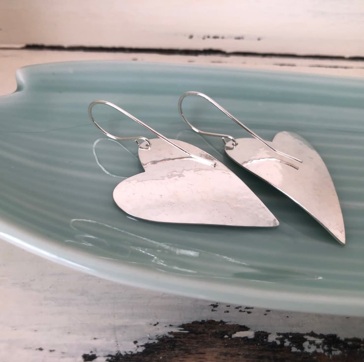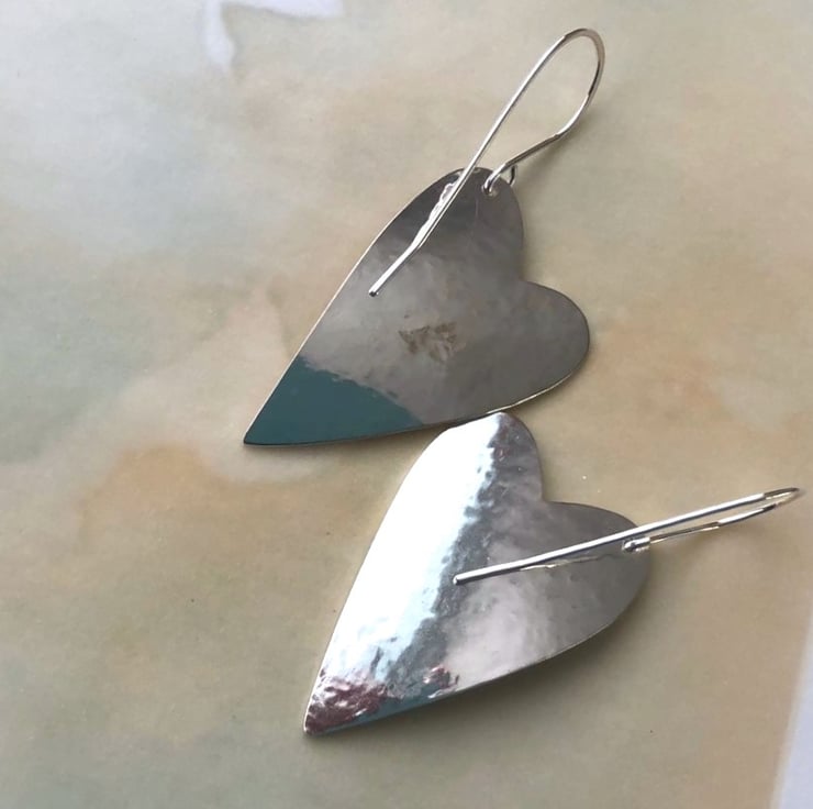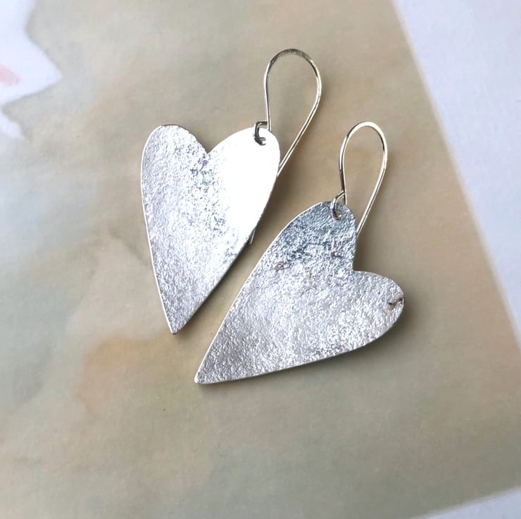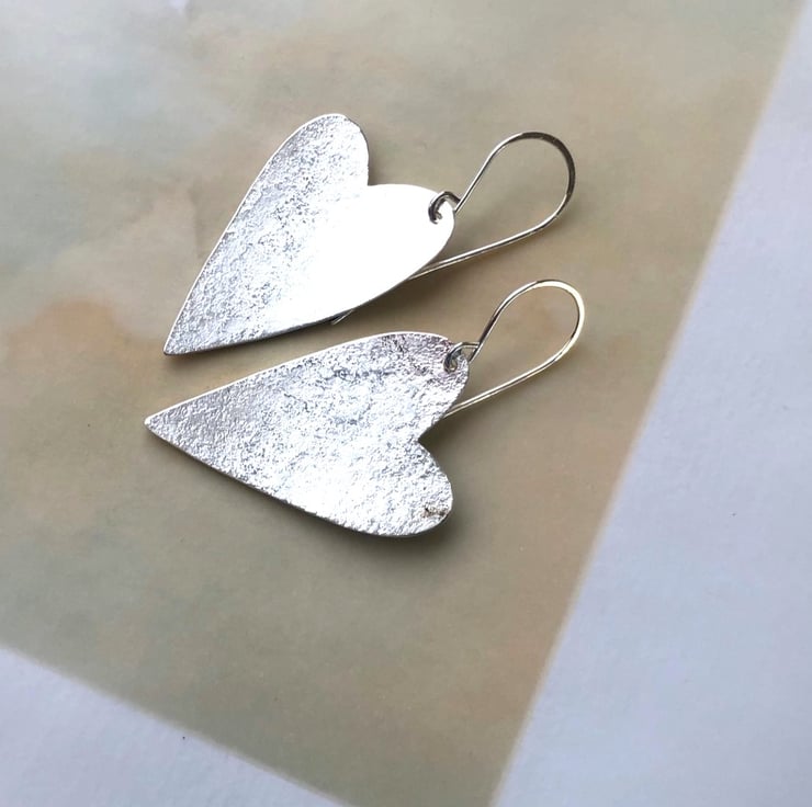 Sterling silver heart earrings with a textured finish on the front and hammered & polished on the back. Hung on quite curvy silver ear wires, they measure approx. 40mm on the longest edge x approx. 23mm wide. Length from the top of the ear wire to point of heart is approx. 52mm.