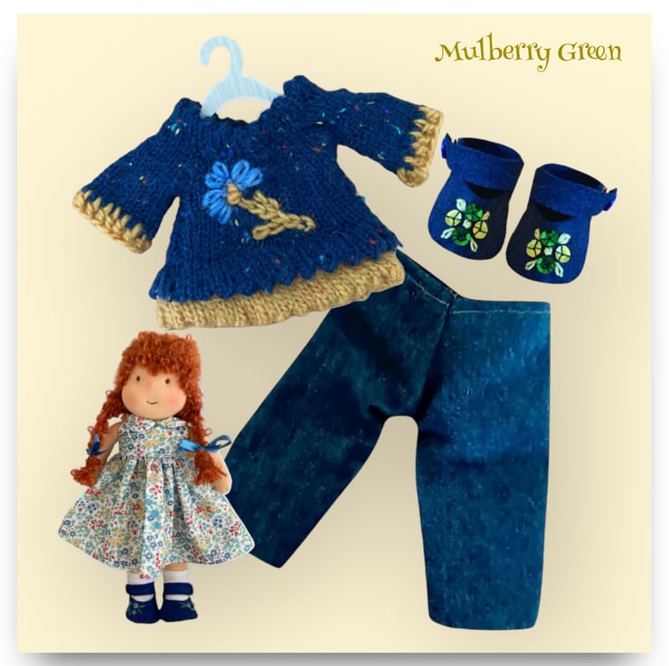 A lovely picot edged jumper, embroidered with a flower, to fit the Mulberry Green characters. The jumper is hand knitted and fastens with a little popper at the back.