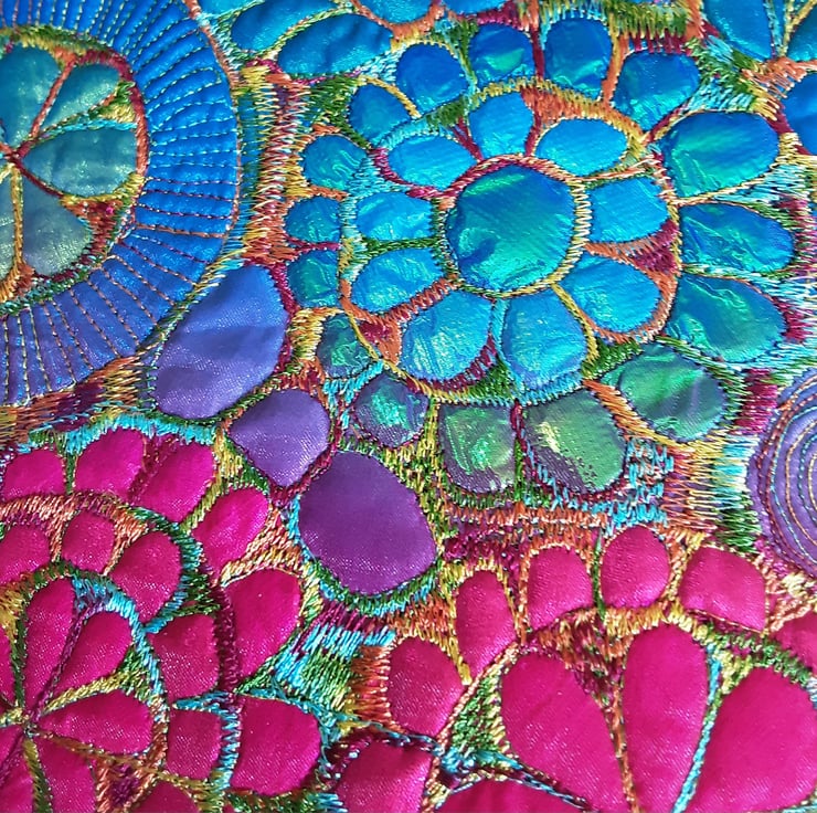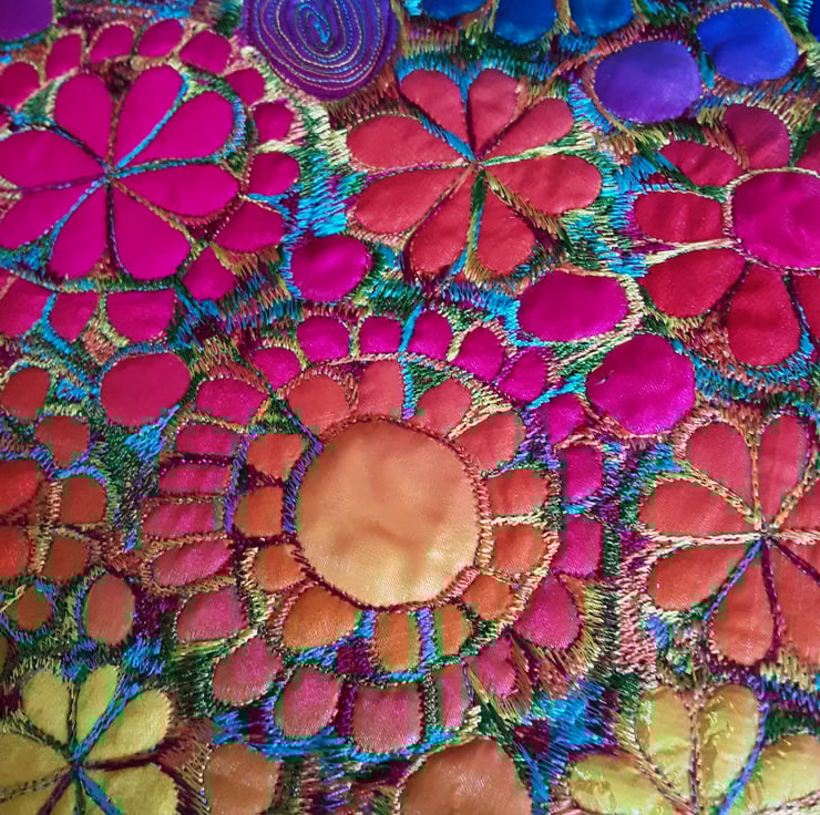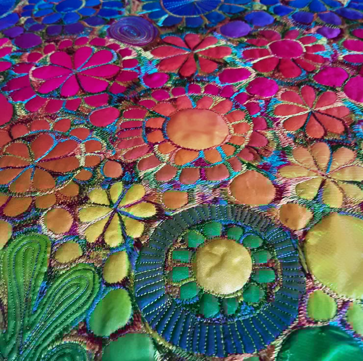 This is the largest piece of work I have accomplished so far in my free machine embroidery journey and I wouldn't be able to work any larger due to the density of the fabric and the small size of the throat of my machine. I am over the moon with the finished artwork.