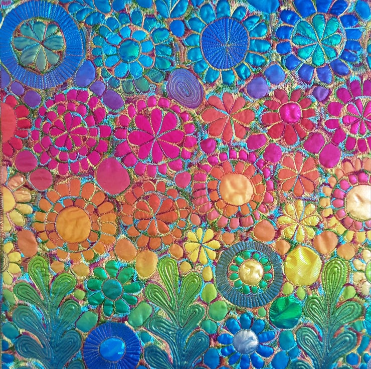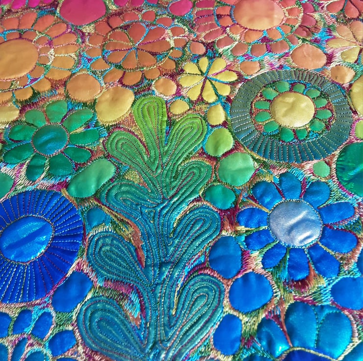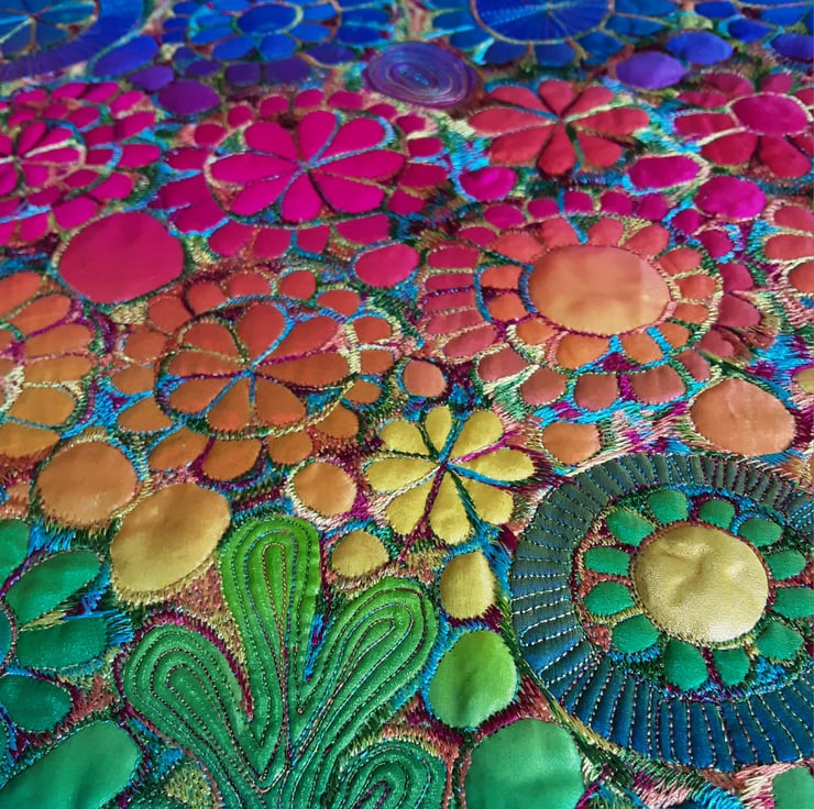 This is a large artwork with hand dyed Egyptian cotton and silks, appliqué and free motion embroidery.