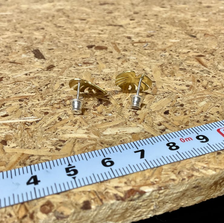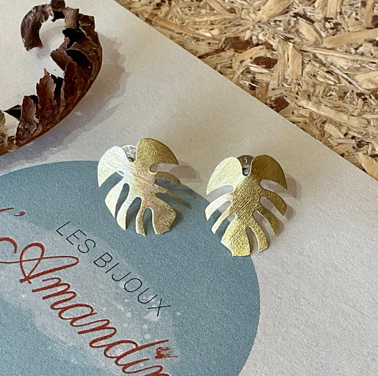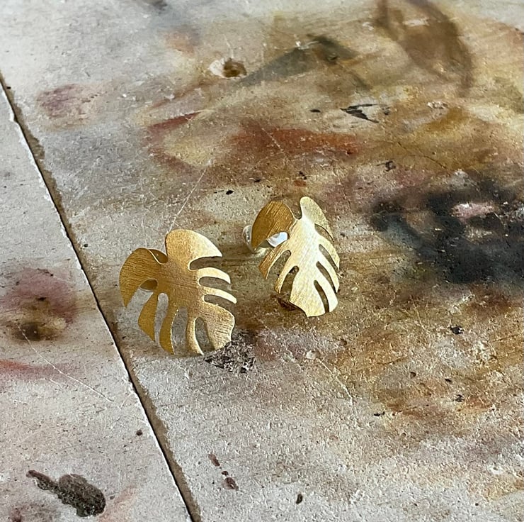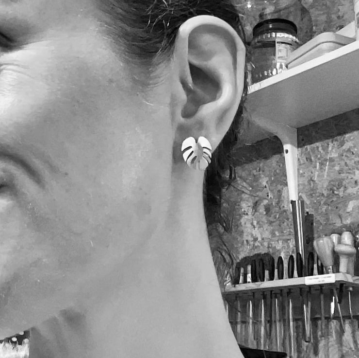 The golden monstera earrings are comfortable and easy to wear. With sterling silver posts and stoppers, they are lightweight and secure on your ears allowing for all kinds of outfits and looks. Entirely hand-sawn, their detailed outline reproduces the intricate design of the monstera leaf. The surface has a slight textured effect. Rub them with a clean dry cloth to keep them shiny, or simply let them develop their natural patina.